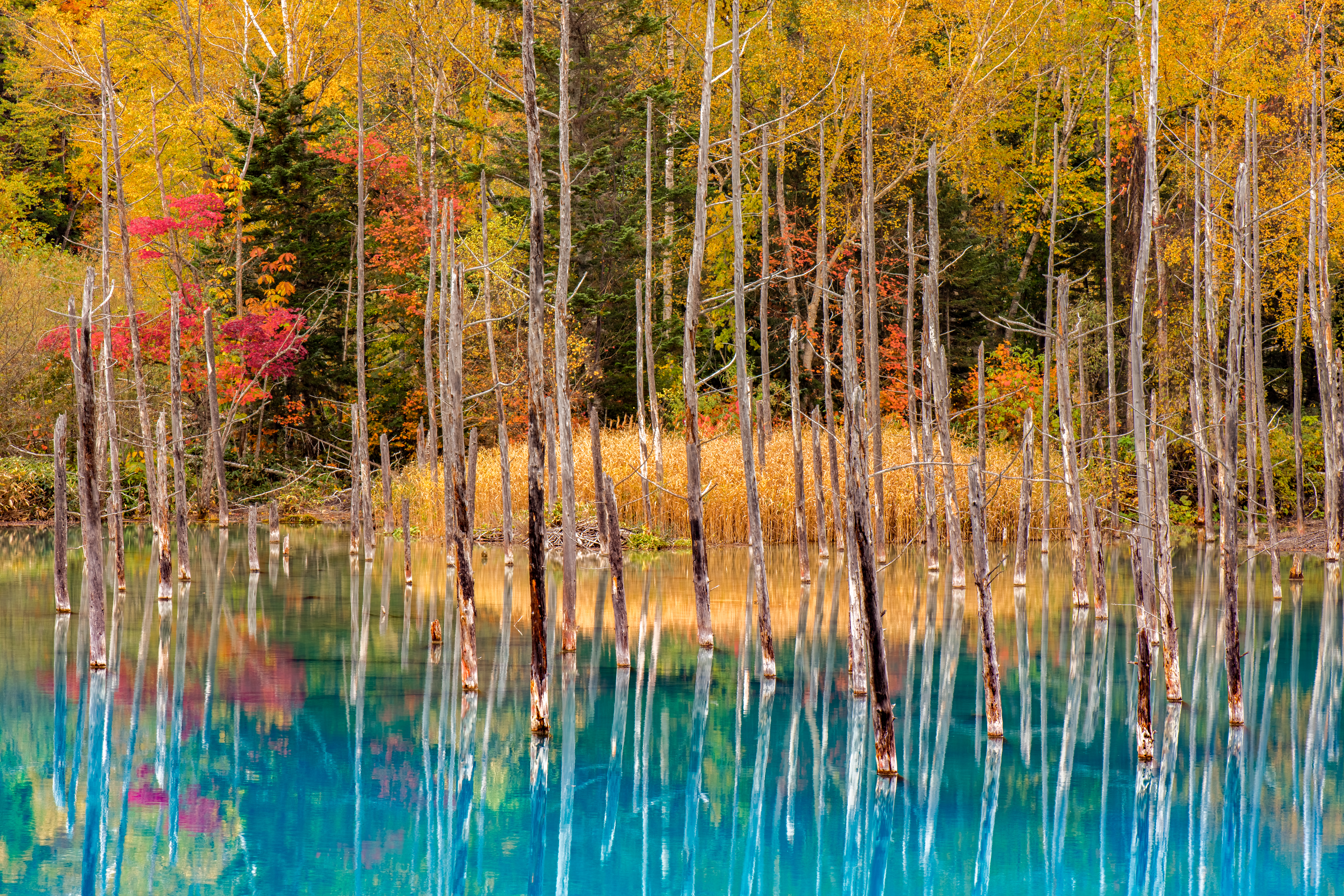 1988年於十勝岳發生火山爆發,為了防止火山泥流蔓延而建設了多個攔河堤,青池就是當時其中的一座攔河堤所形成的水池。而白鬚瀑布的水源在流經懸崖途中混和了鋁,到達青池時便成了如此美景。當季節變更,青池也會產生不同的變化,春季可以看到結冰的水面融化如白沙般;夏季可以欣賞到如天空之鏡的美景;秋季楓葉和枯樹的相輝映下更為動人;冬季則能看到純白雪景覆蓋青池的神秘美景。