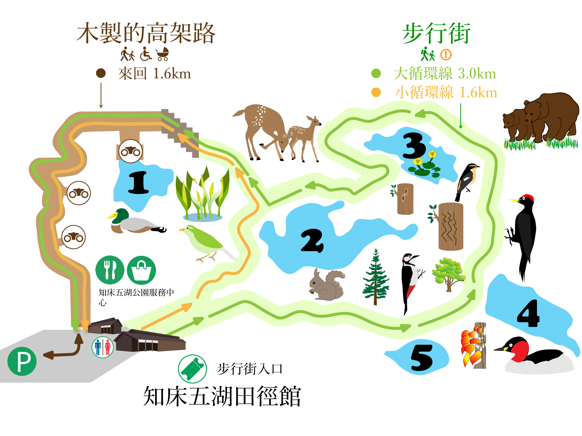 知床五湖的遊覽路線分為高架木道及地上遊步道兩種,前者免費入場且無需預約,但就無法看到野生棕熊,而後者則要事先