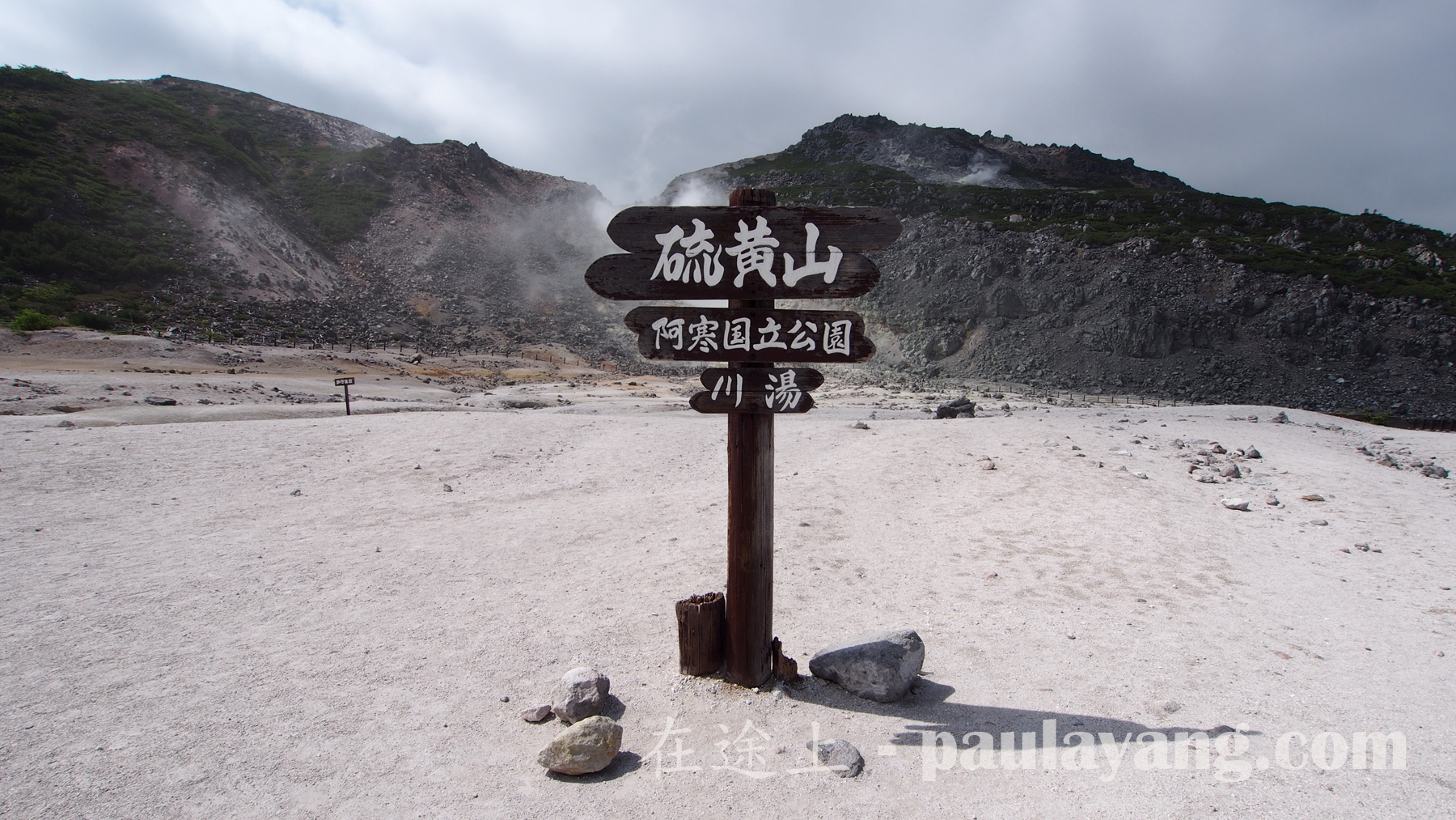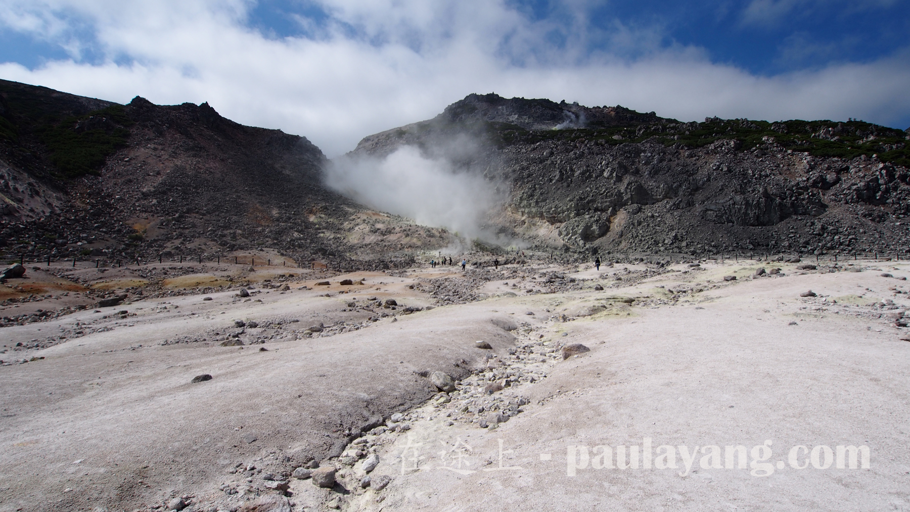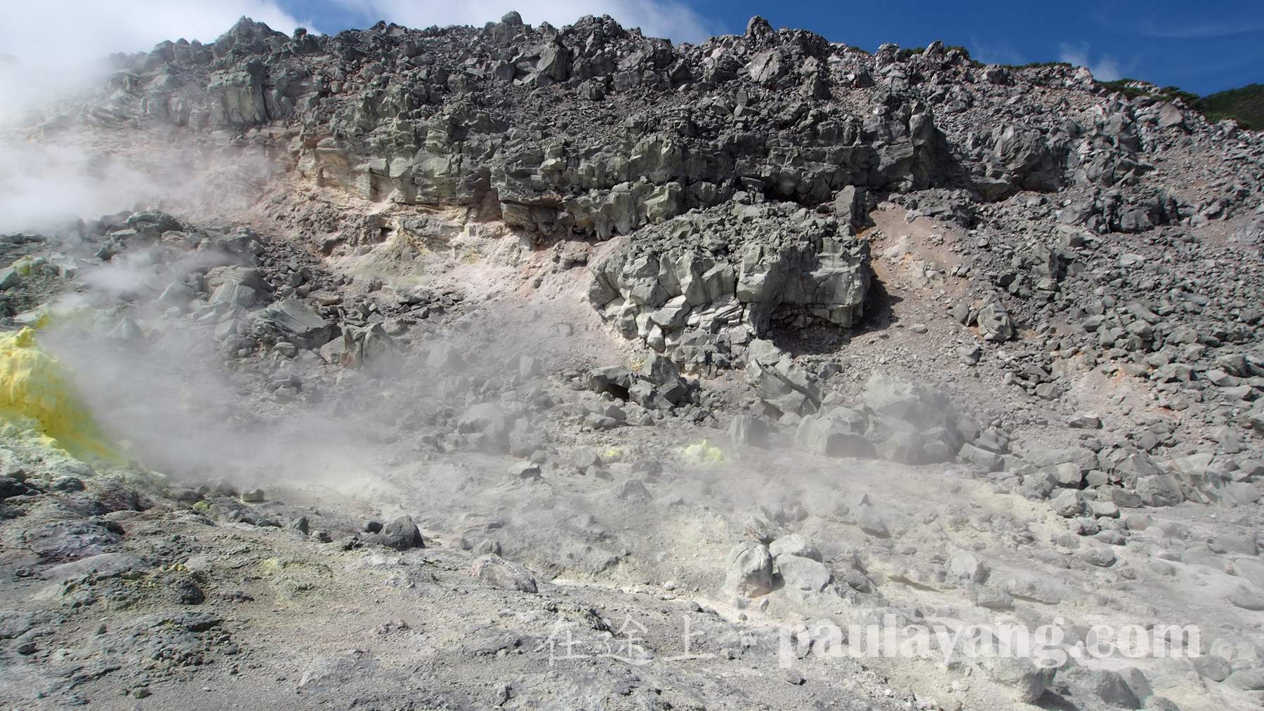 下車已聞到濃濃的硫黃味。因為有硫黃,附近是寸草不生,石頭也薰得灰白,卻也造就這個獨有景色。