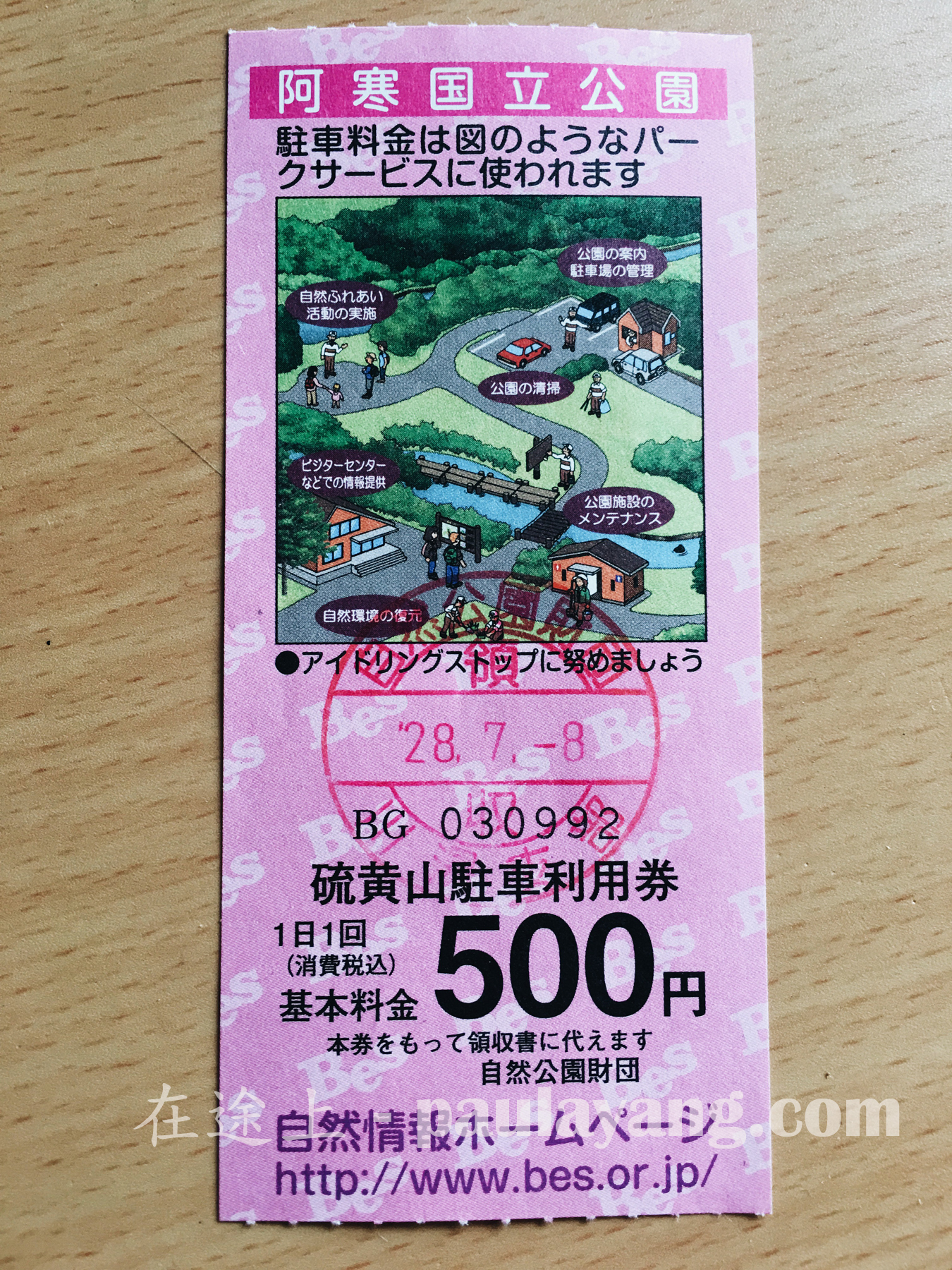 川湯溫泉只有數分鐘車程。這張「硫黃山駐車利用券」除可以在硫黃山泊車外,也可以在摩周湖第一展望台泊車,兩地只相距十多分鐘車程。