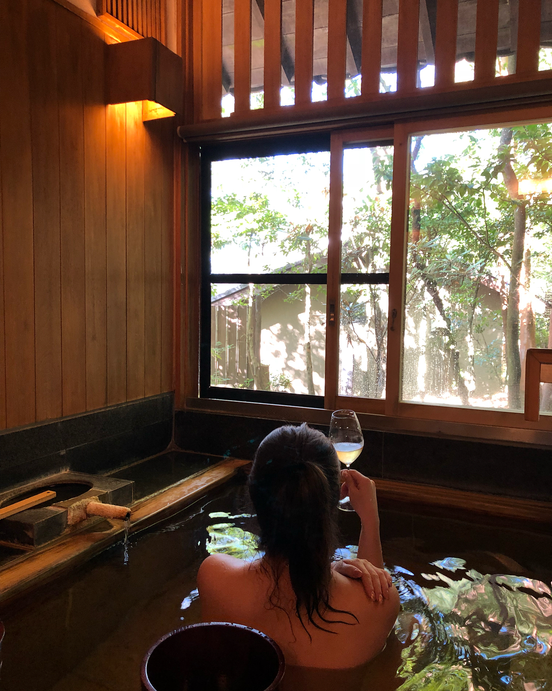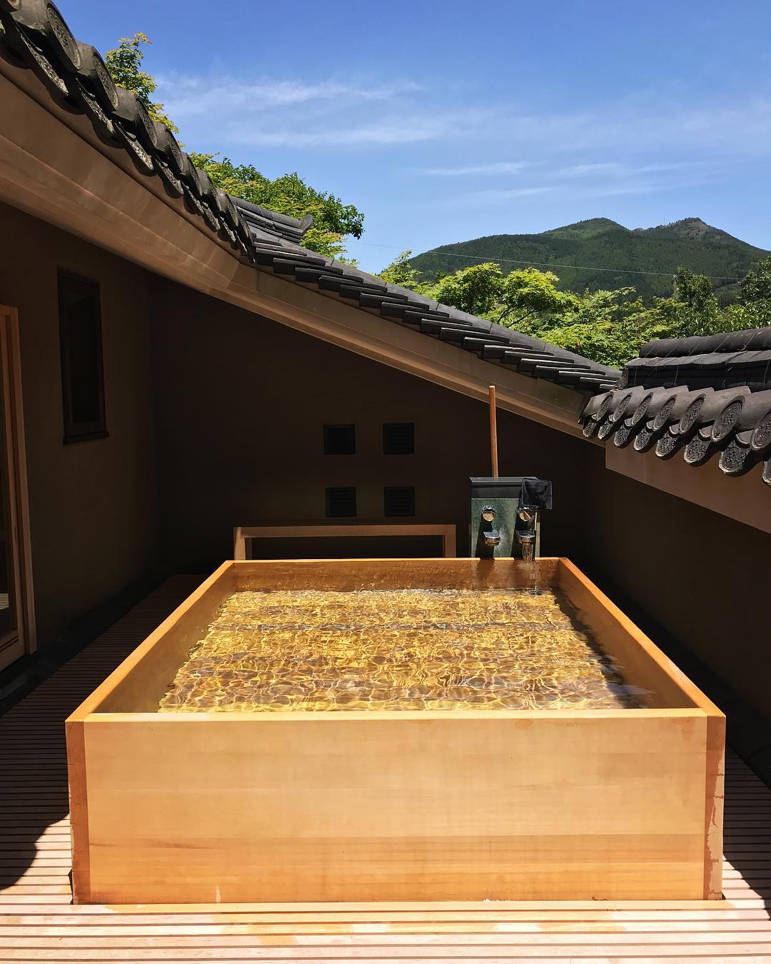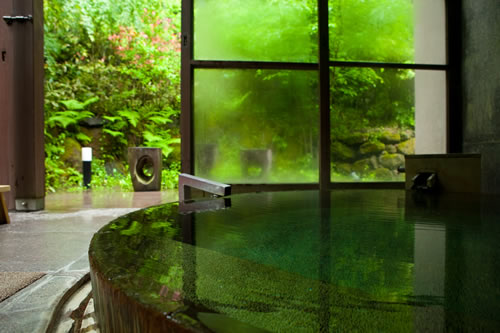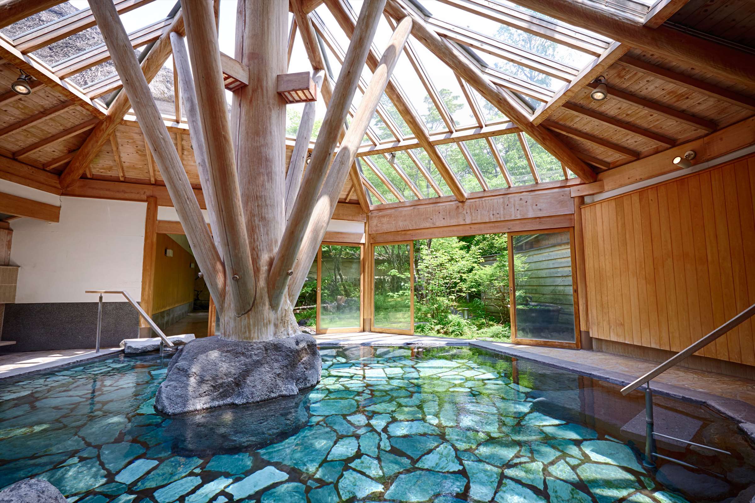 除了客房內的個人溫泉外,龜之井別莊亦擁有透明天井的六角形大浴場,以木材及石材為主建成,再以自然透光的形式讓住客體驗到於大自然中泡湯的滋味。