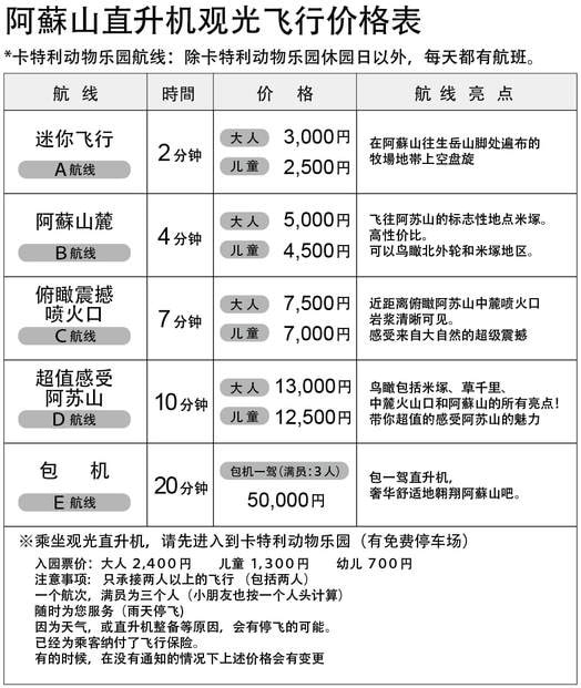 阿蘇山遊覽飛行收費表(Helicopter sightseeing flight)|圖片來源:cuddly.co.jp