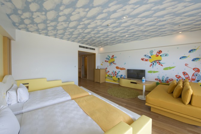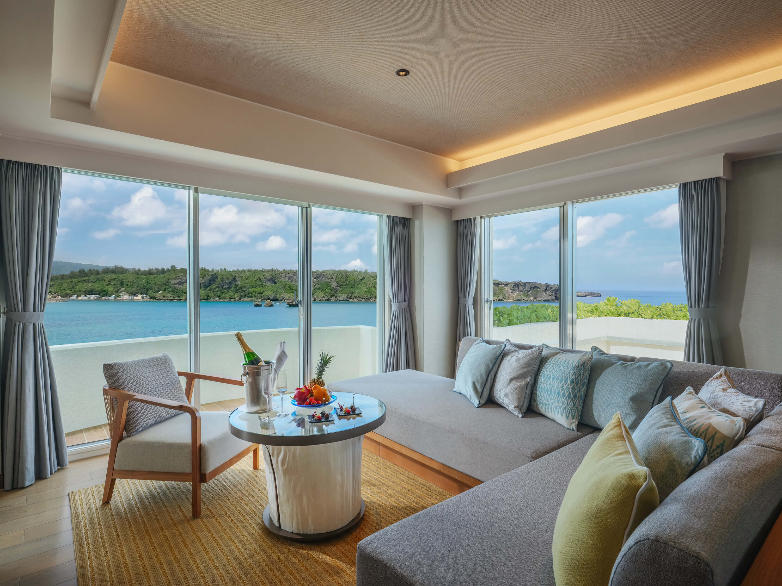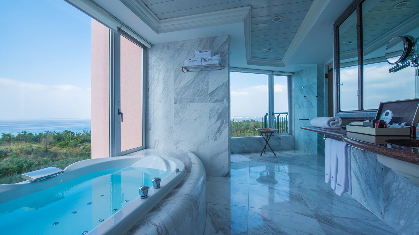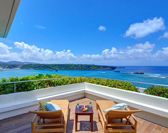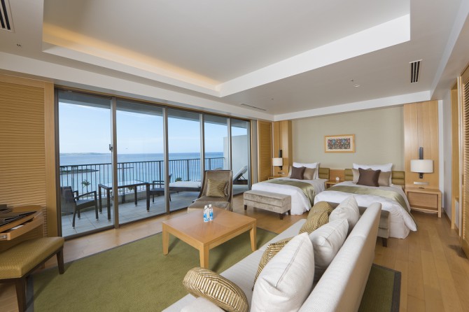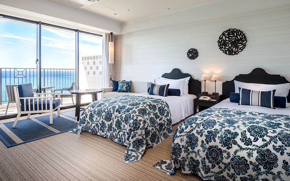 酒店所有客房均為海景房,房間內以英國風格為基調,設計上以沖繩的天空和海為主軸,有些房型的浴室更直接面對大海,在享受浸浴同時,也可以欣賞沖繩海邊美景。