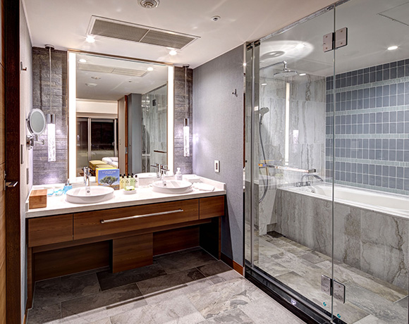酒店房間設計比較古典,以較穩種的色系為主,整體有尊榮的貴氣感。而房間靠近窗面,還有一區的休憩沙發區,足不出戶就可以欣賞到窗外迷人景致。而浴室則是改走明亮氣氛,以大量石材打造高雅質感。