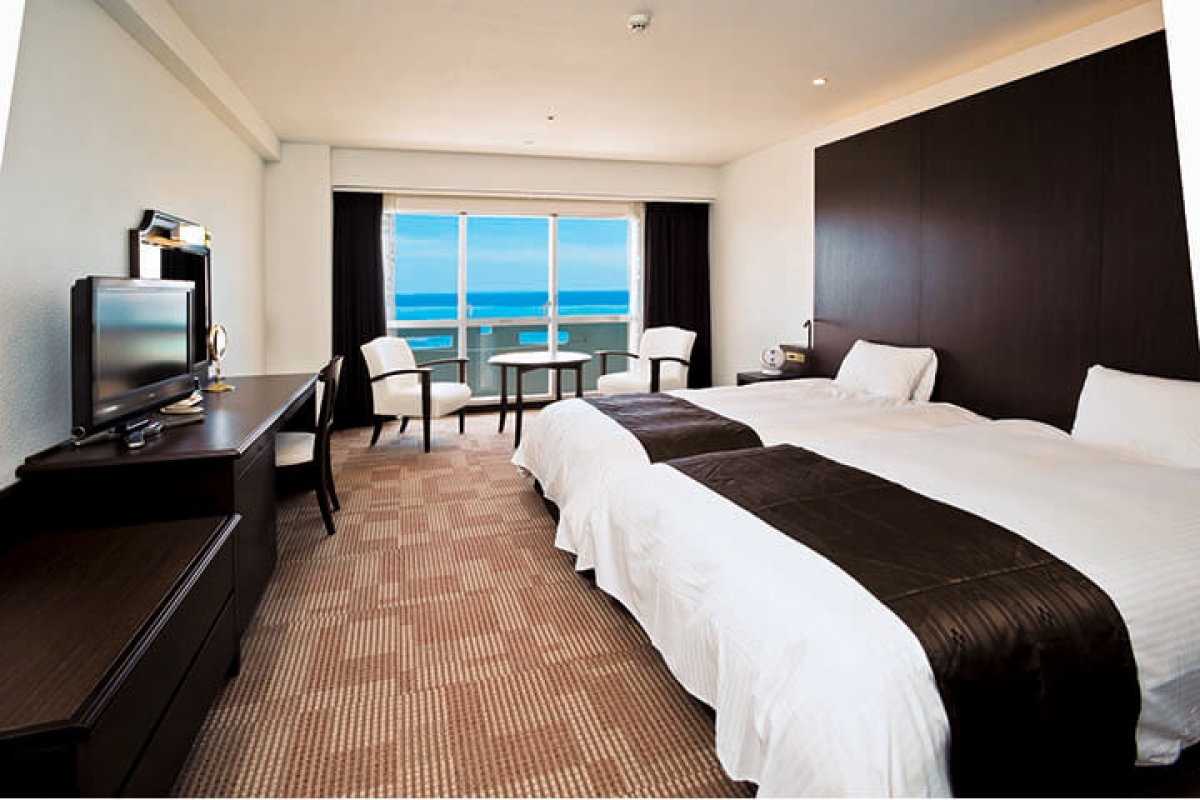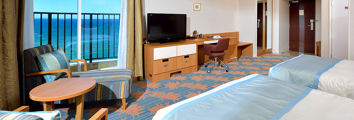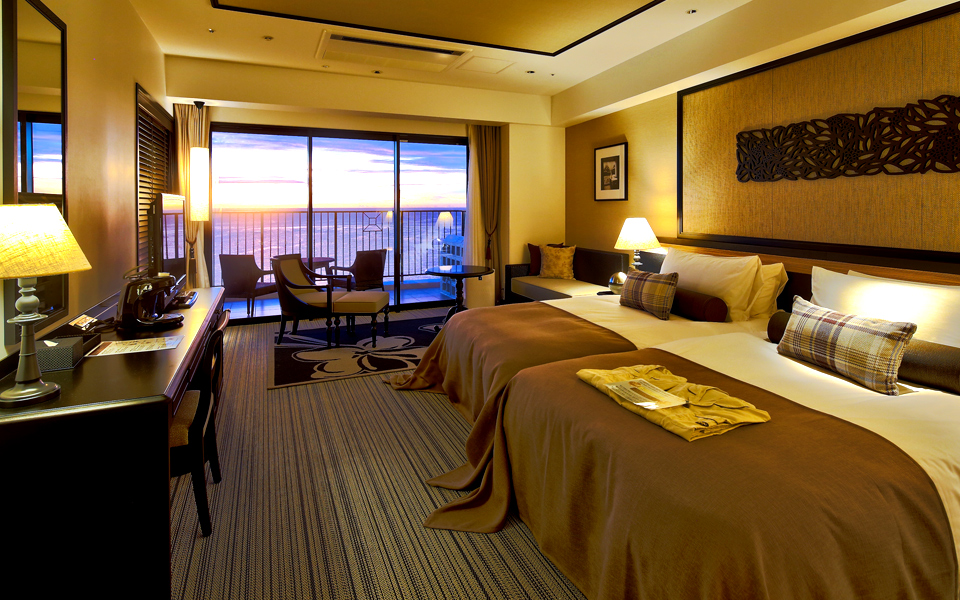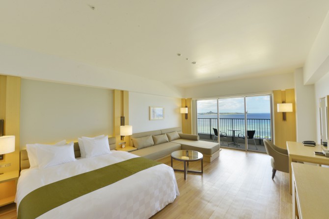 酒店房間以現代簡約風為主,熱帶色系帶出濃濃的渡假風,每一間房間皆有獨立陽台,能欣賞壯麗的沖繩海景。