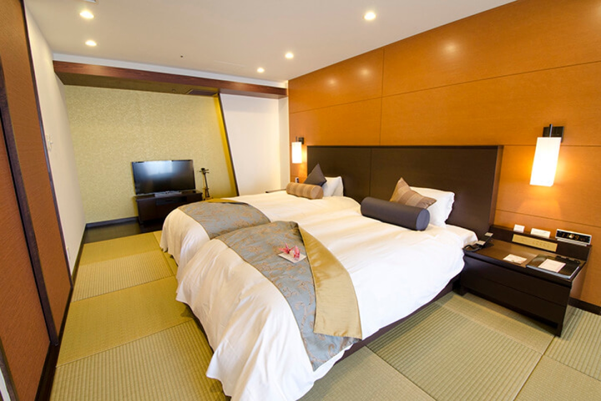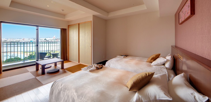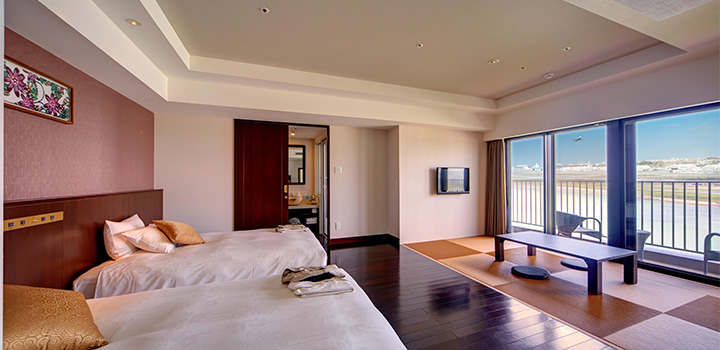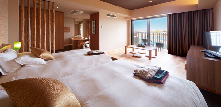 酒店客房分為海景房、露天風呂房及機場景色房,打開窗簾直接可以欣賞到各種景色。房間設計精緻溫馨,柔和的燈光配上原木色的家具,整體氛圍令人放鬆。