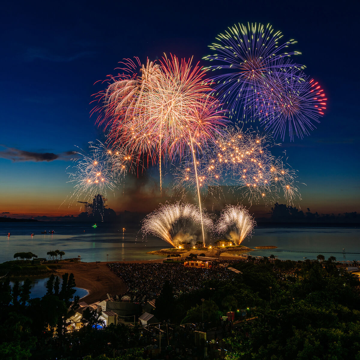 海洋博公園花火大會是沖繩規模最大的夏祭花火大會之一,每年都有不同主題吸引近4萬人次,依次發放一萬發煙花,非常壯觀。花火大會與海洋博公園Summer Festival(海洋博公園サマーフェスティバル2019)同時舉行,開始前沙灘已設有不少攤位遊戲、小食、現場音樂會等活動,氣氛熱烈!
