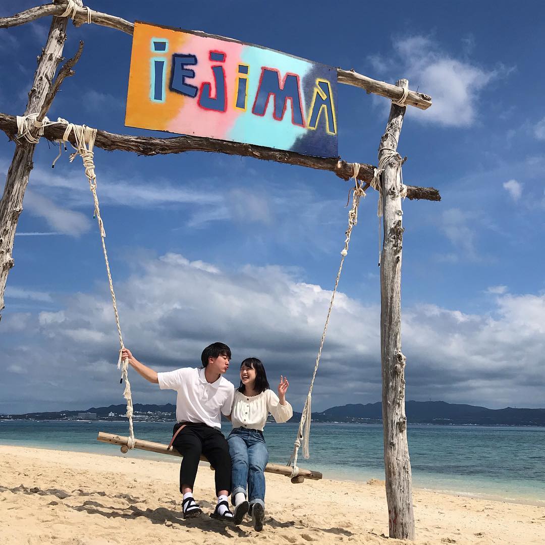 想嬉水就可以來到伊江海灘,因為島上的旅客不多,即使是旺季來到,也不會像沖繩本島一樣人多,可以寧靜舒適地享受陽光與海灘,眺望遠處的瀨底島,附近還有露營場所「伊江村青少年旅行村」可以在海邊住上一晚。而且沙灘上還有個熱門打卡熱點,就是寫著伊江島(iejima)的巨型木鞦韆!
