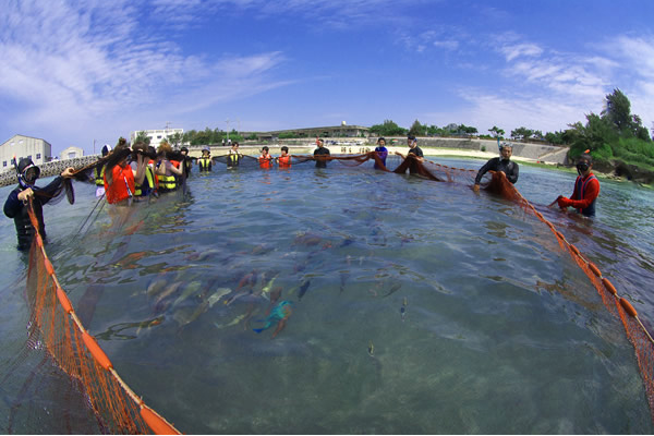 眾多個活動之中,小編個人就最推薦伊江島特有的捕魚體驗!幾十個人穿好潛水服,來到海邊排排站好,拿起長長的漁網聽著口號就一起向海衝!大約跑到離岸50米的位置,再開始往回走,然後一上到岸後就發現,有大群魚成功被漁網撈起來了,真的成功感滿滿啊!活動形式又有點像中小學時期的團體遊戲,大人小孩都玩得樂在其中!