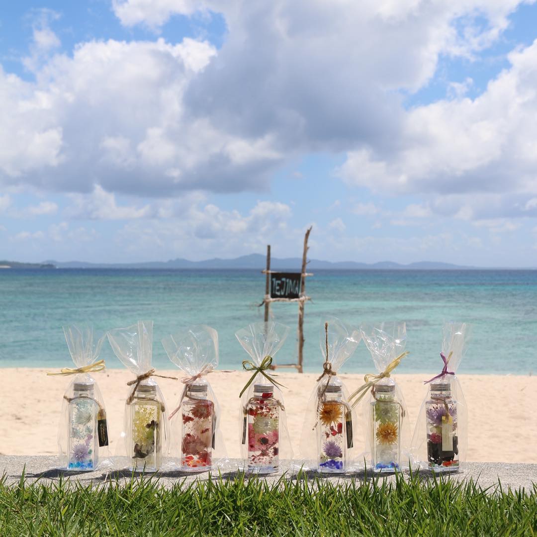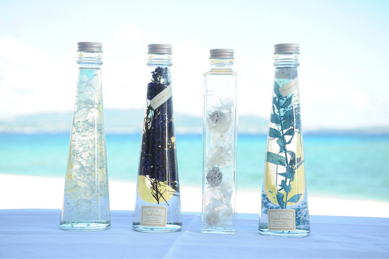 喜歡做手作的話,就可以來體驗一下製作漂亮的浮游花!在正式製作之前老師會先講解一下,各種花的花語,以及不同顏色的花所代表的意義,像是粉紅色是愛情、黃色是希望、藍色是信賴等,最後再建議配色並說明瓶身製作方法,大家可以按喜好選擇不同乾燥花材與琉球玻璃,放進玻璃瓶中裝飾,最後再倒入一種含有礦物油的特殊油品就完成了!