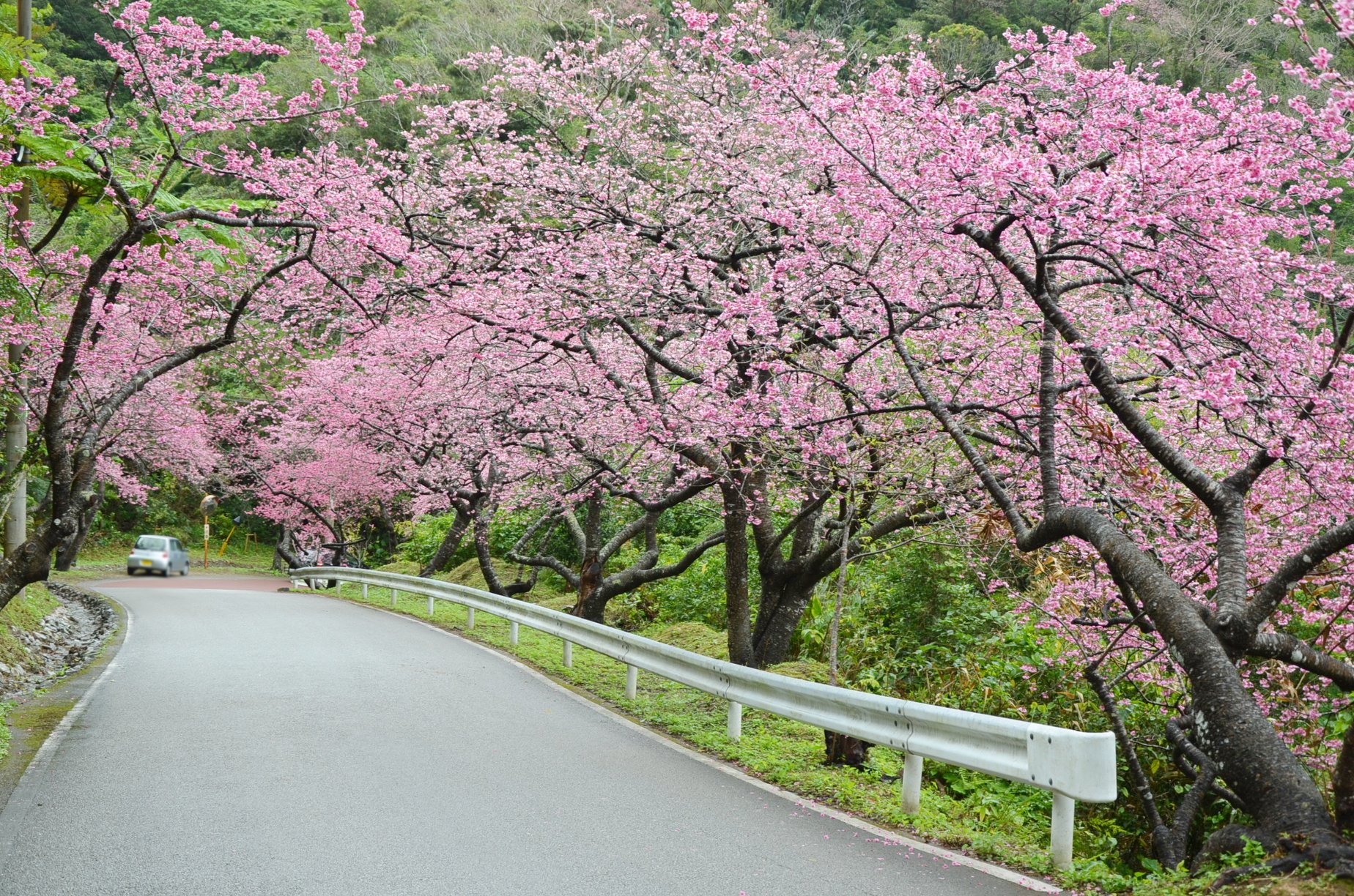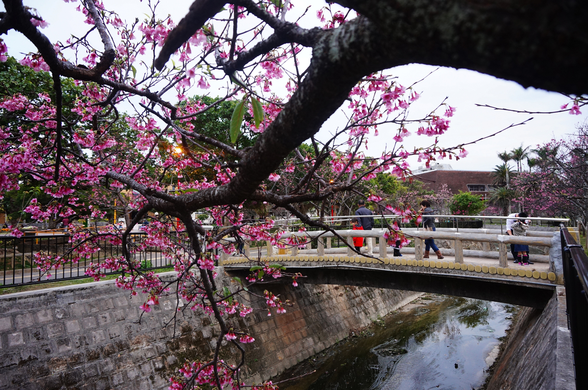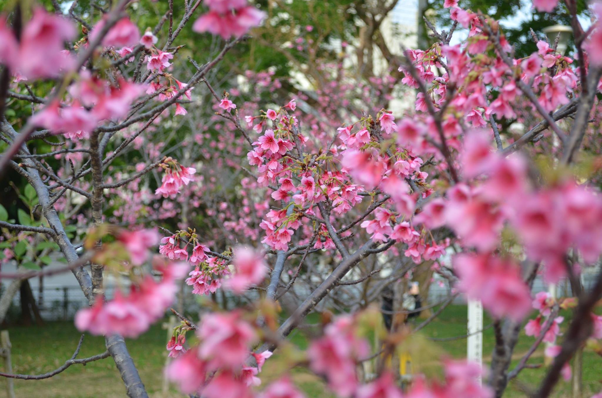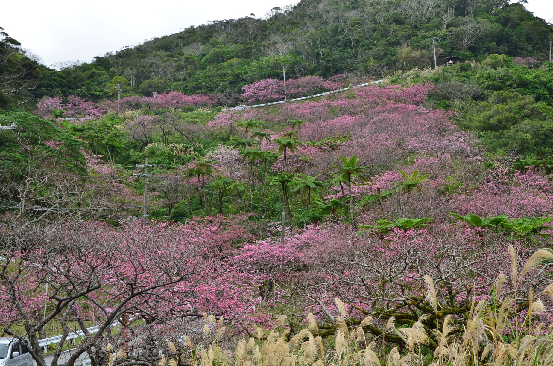 沖繩的櫻花是全日本最早開花的,對比一般在春季三至四月開花的日本櫻花,沖繩的「緋寒櫻」(カンヒザクラ)在每年一月下旬至二月下旬盛放,所以即使是冬天,沖繩也是可以看到櫻花的。緋寒櫻的顏色比一般日本看到的粉色系要深一點,近似梅花的鮮艷顏色,在其他植物枯萎的冬日裡更顯突出。