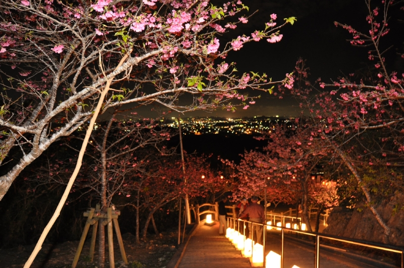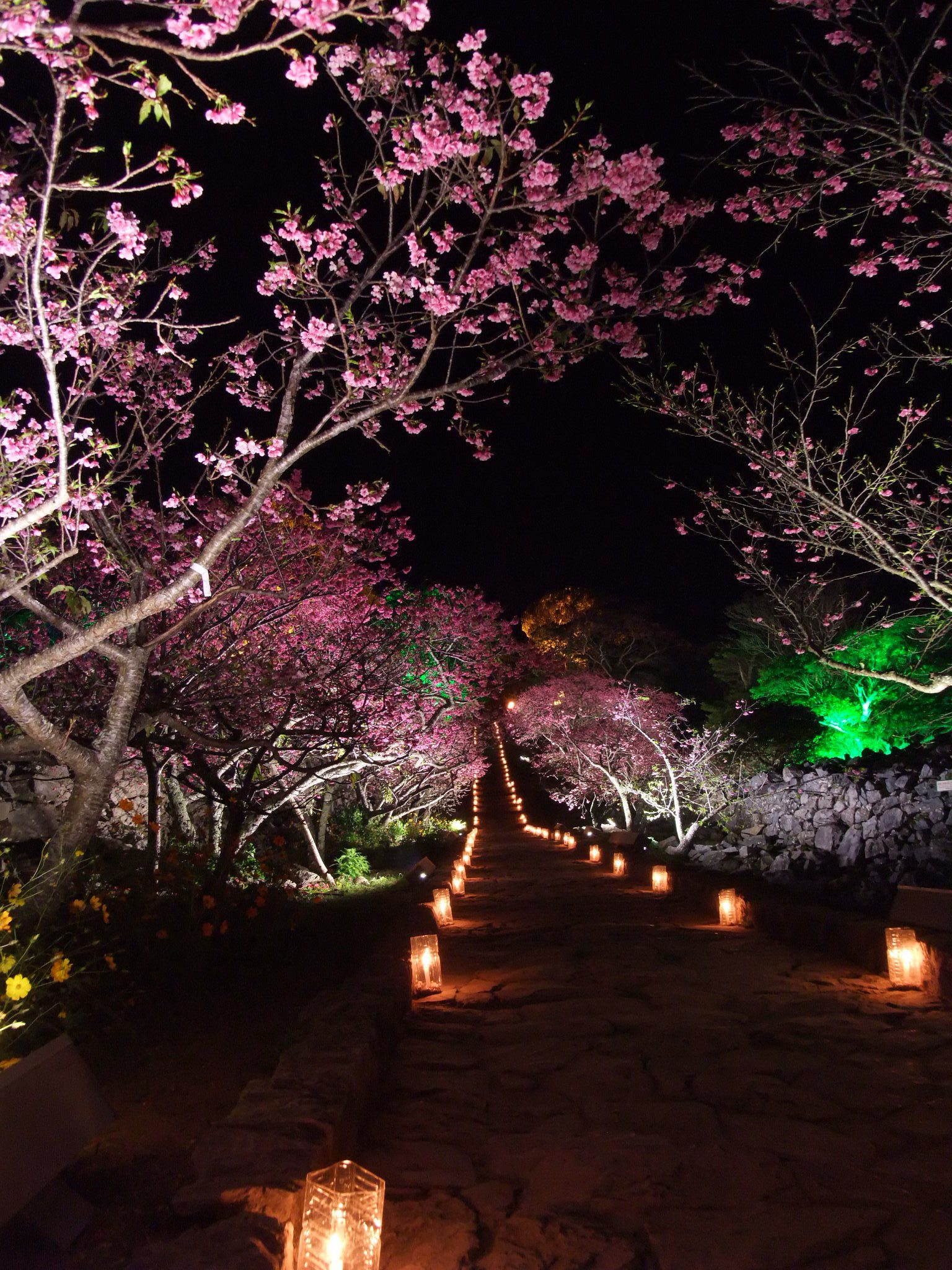 世界遺產今歸仁城跡每年一月下旬至二月上旬均開滿緋寒櫻,由平郎門至今歸仁城城内的表參道兩旁種滿櫻花,晚上更會加開夜櫻點燈的特別活動,在五光十色的燈光映照下,櫻花和古跡均增添一份神秘浪漫的感覺。