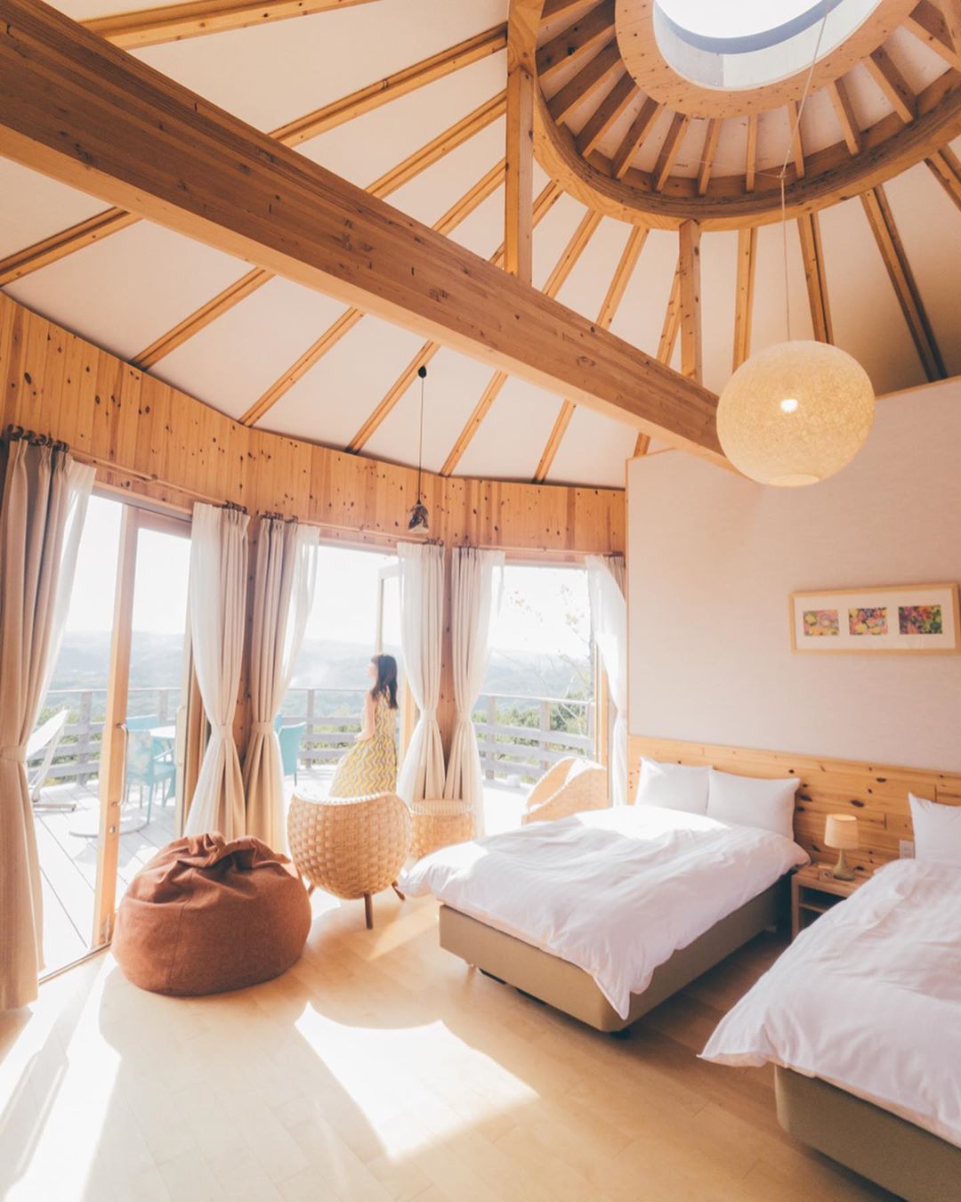 到二次元之森遊玩完一整天,可以考慮入住園區的度假村喔!2018年開業的Grand Chariot 北斗七星135°(グランシャリオ北斗七星),擁有二十三幢以繭為設計概念的別墅式建築,散落於山丘各處。除了一般的房間外,更有超人氣的Hello Kitty主題客房!房內四處都是Hello Kitty的裝飾,備品全都是Hello Kitty,抬頭一看,連頭上的觀星窗都有Hello Kitty和你一起觀星喔!