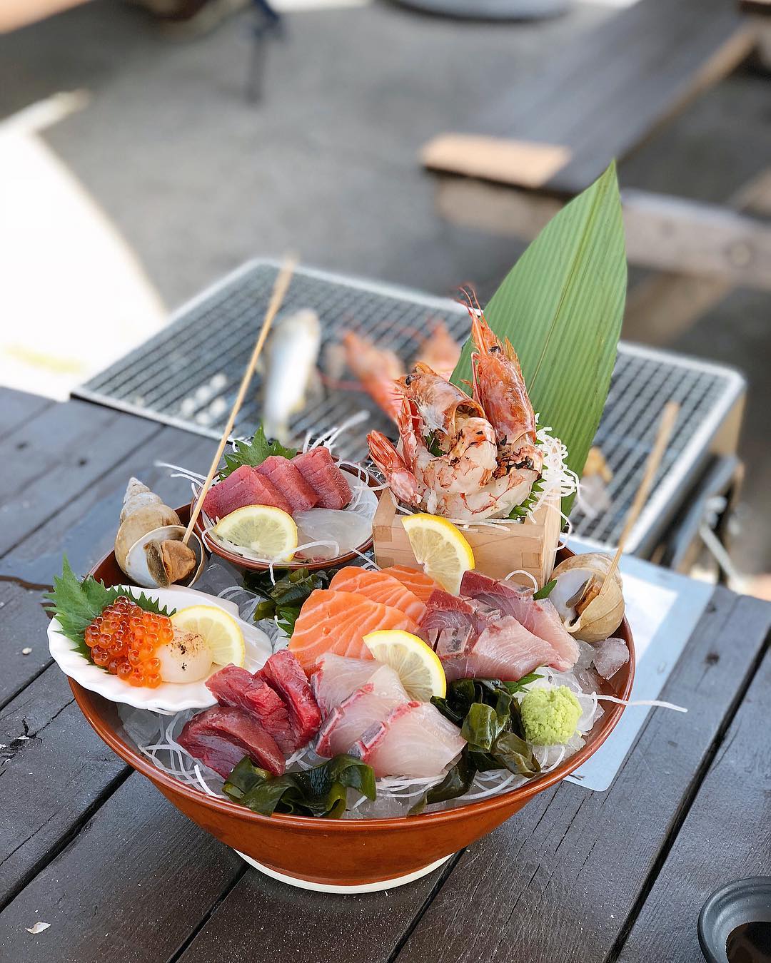 而中之島漁港除了各類新鮮海鮮丼任君選擇,還可以即場挑選新鮮海產體驗海鮮燒烤。所有海產都是來自日本其他縣市,即日捕捉最新鮮的活海產,到你選擇後再處理成為食材。
