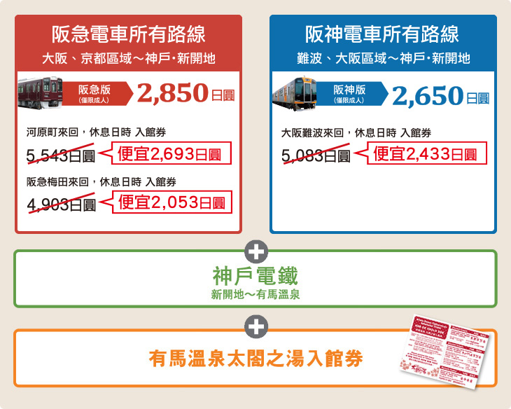 按交通介紹的解說,搭乘阪急電車由大阪梅田前往有馬溫泉,來回車費約2,020円,而太閣之湯的入館費為2,400~2,700円,購買這個套票就差不多等同於免費入場了,所以非常推介!【出售地點】