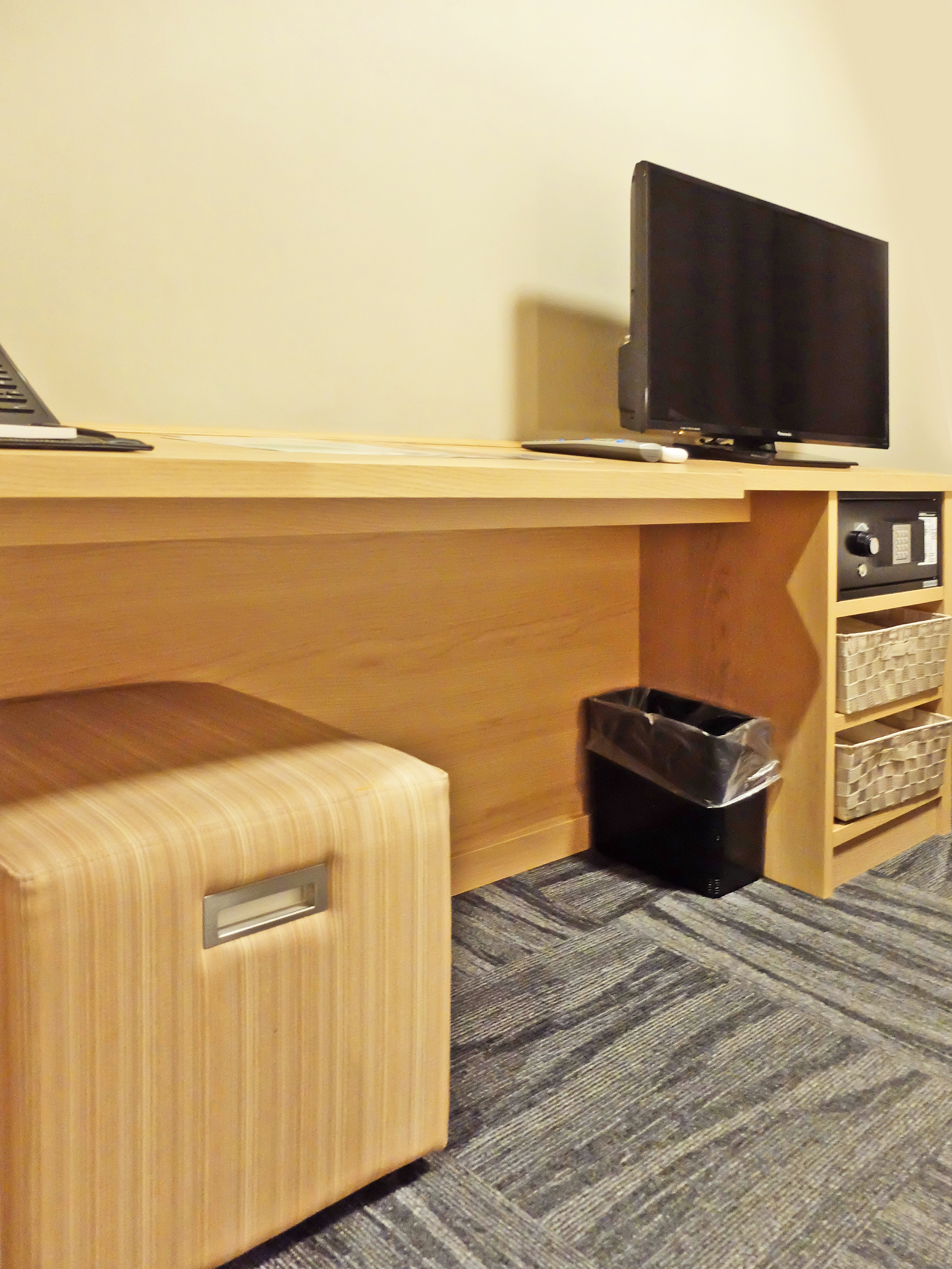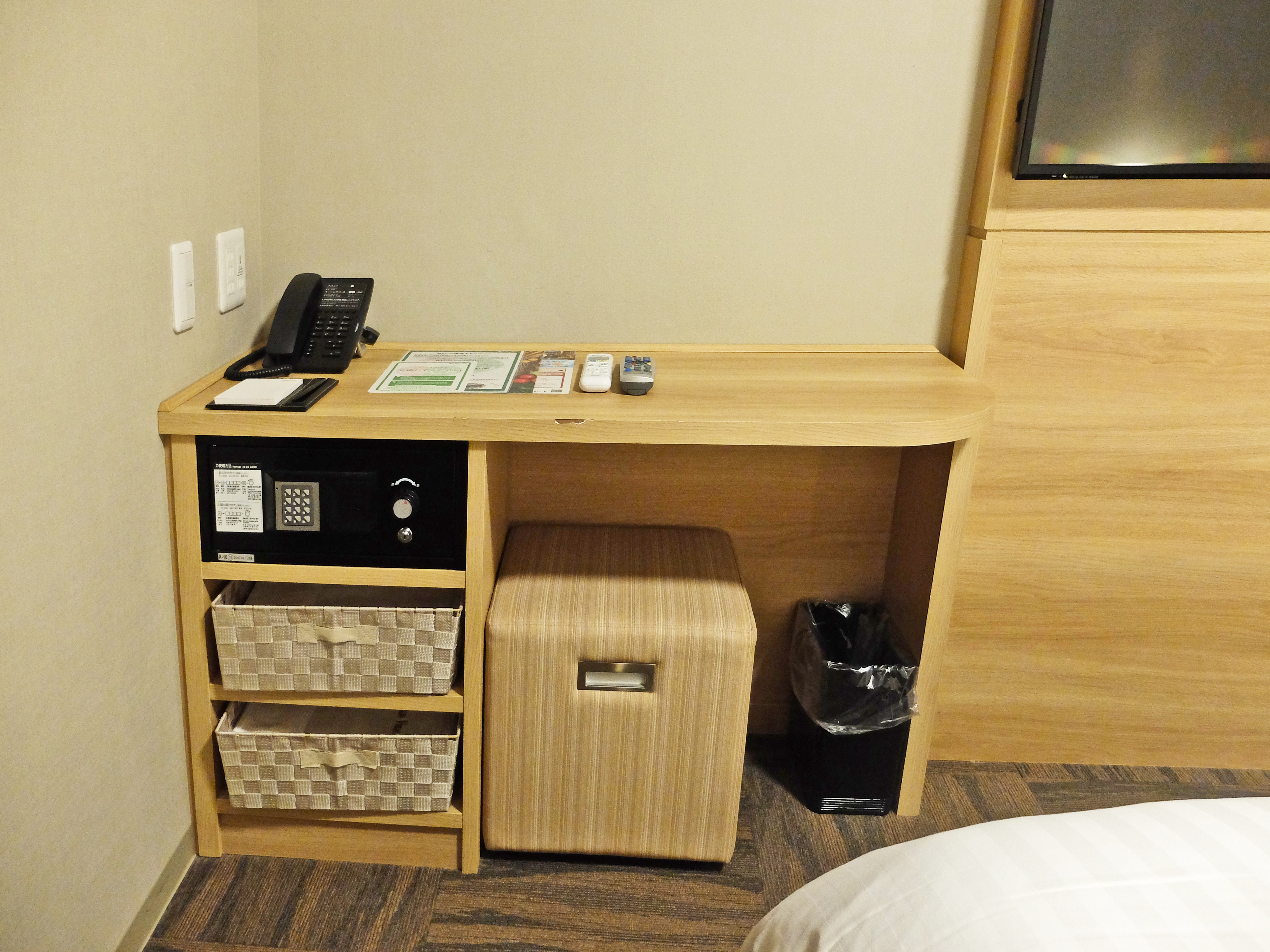 電視旁有小書桌,夾萬下的籃子放了睡衣、毛巾等
