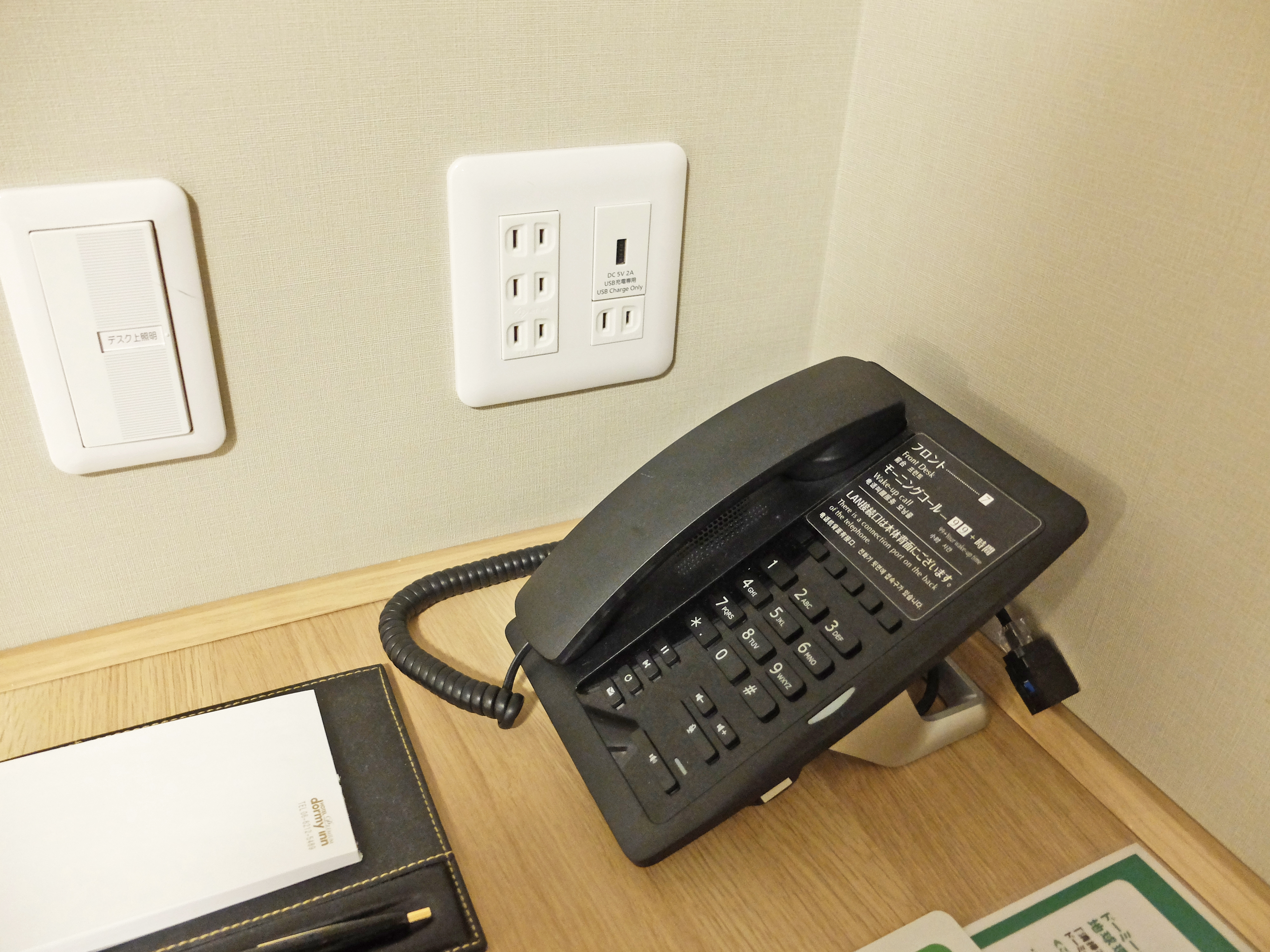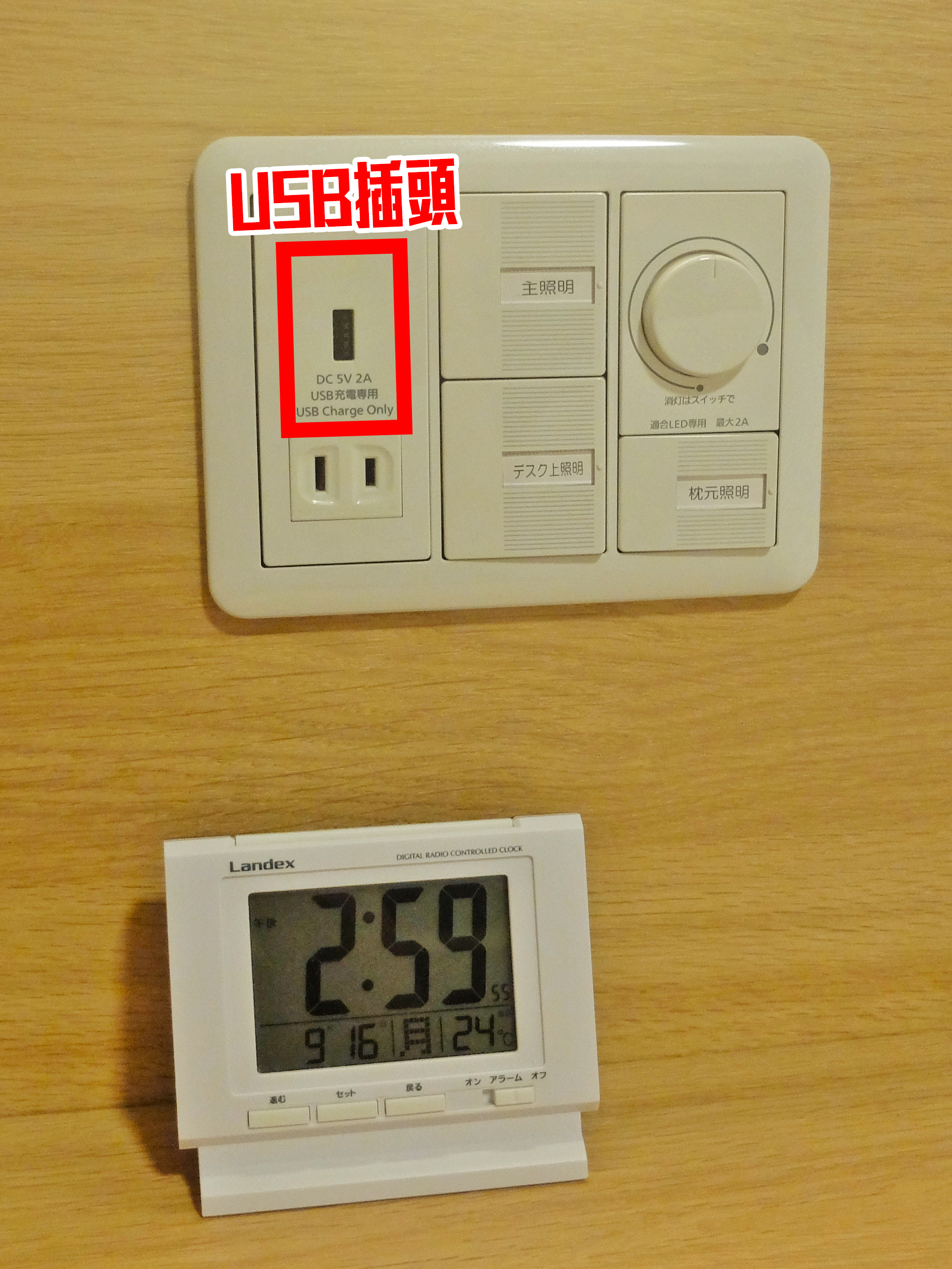 Dormy Inn PREMIUM 難波別館 新張不到一年,設計上也考慮到旅客的充電需求,在床頭兩邊都設有USB插頭和日本兩腳插頭,只需要充電話的話就轉插也不用準備了。書桌那邊也有USB插頭和4個兩腳插頭,數量充足,位置也實用。