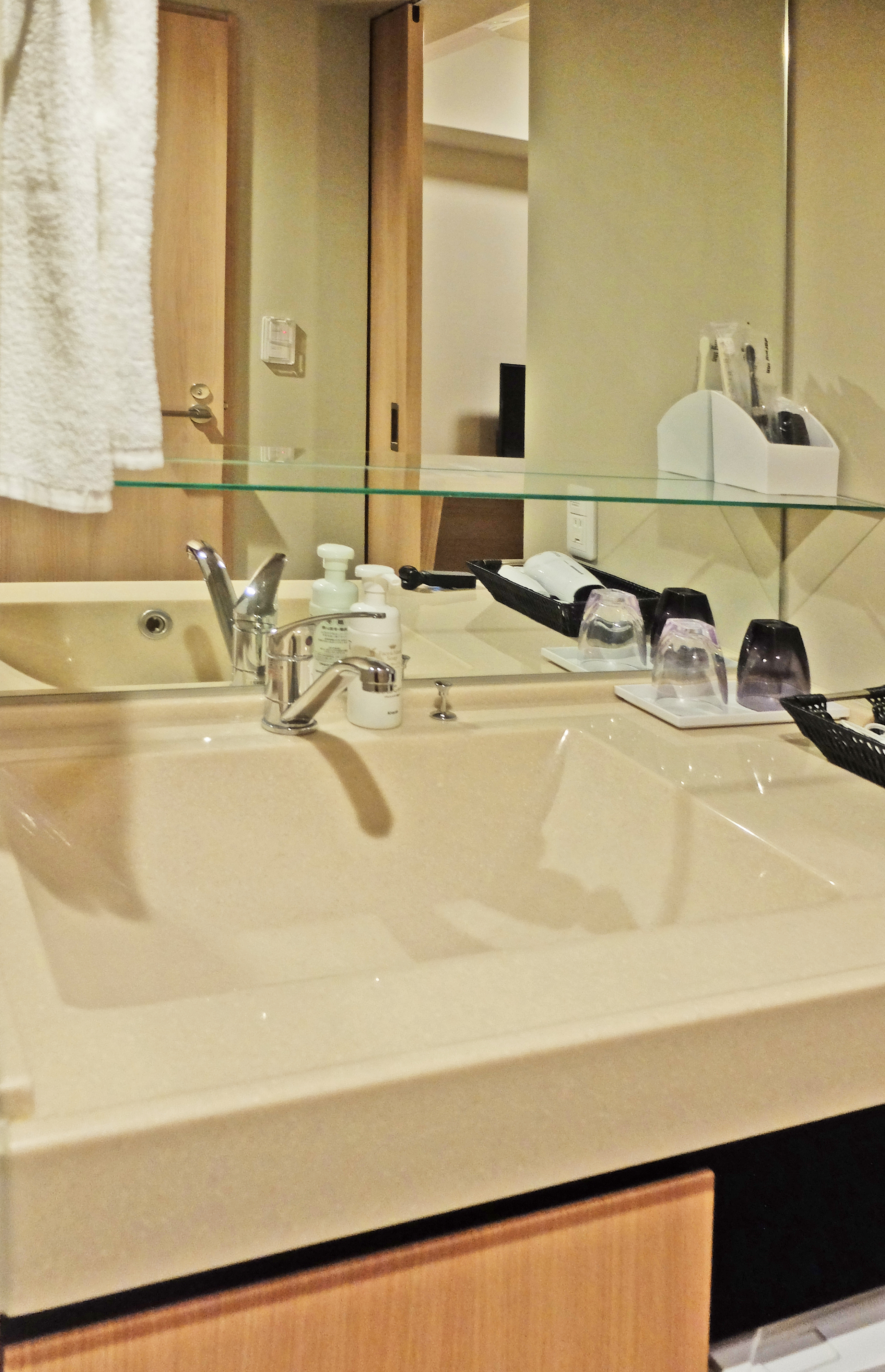 Dormy Inn PREMIUM 難波別館 的洗面台,首先,鏡子夠大;其次,燈光的角度/亮度都適合化妝打扮;最喜歡他們在洗面台上加了一層玻璃層架,放置護膚品、化妝品的空間充足,也不會被洗手盆的水弄濕。如果洗面台那邊多設一個小垃圾桶的話就完美了,現在的話 用過的化妝棉、護膚品包裝就需要拿到書桌那邊丟。
