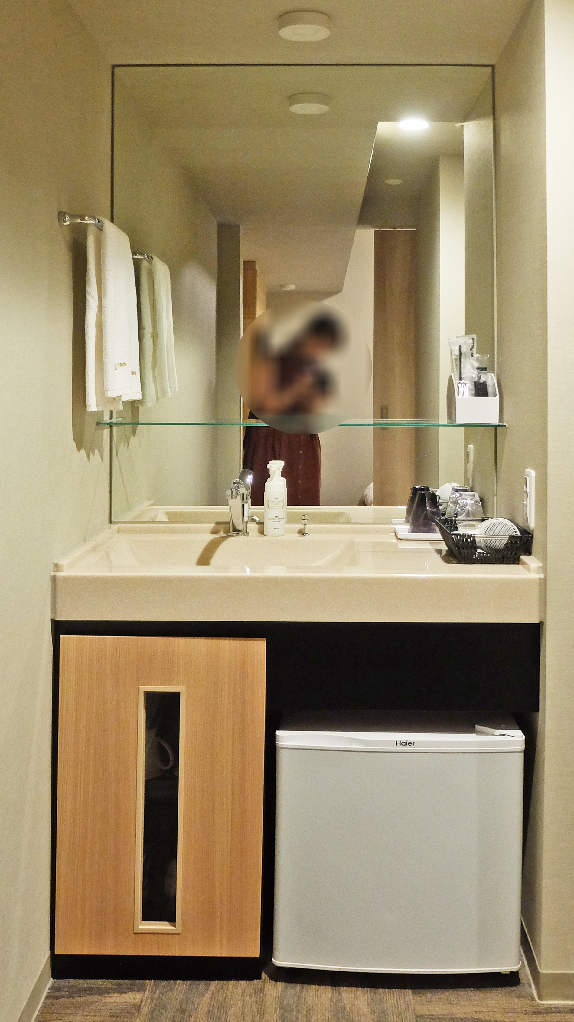 洗面台上放了備品、風筒,下面是雪櫃、電熱水壼、杯子等