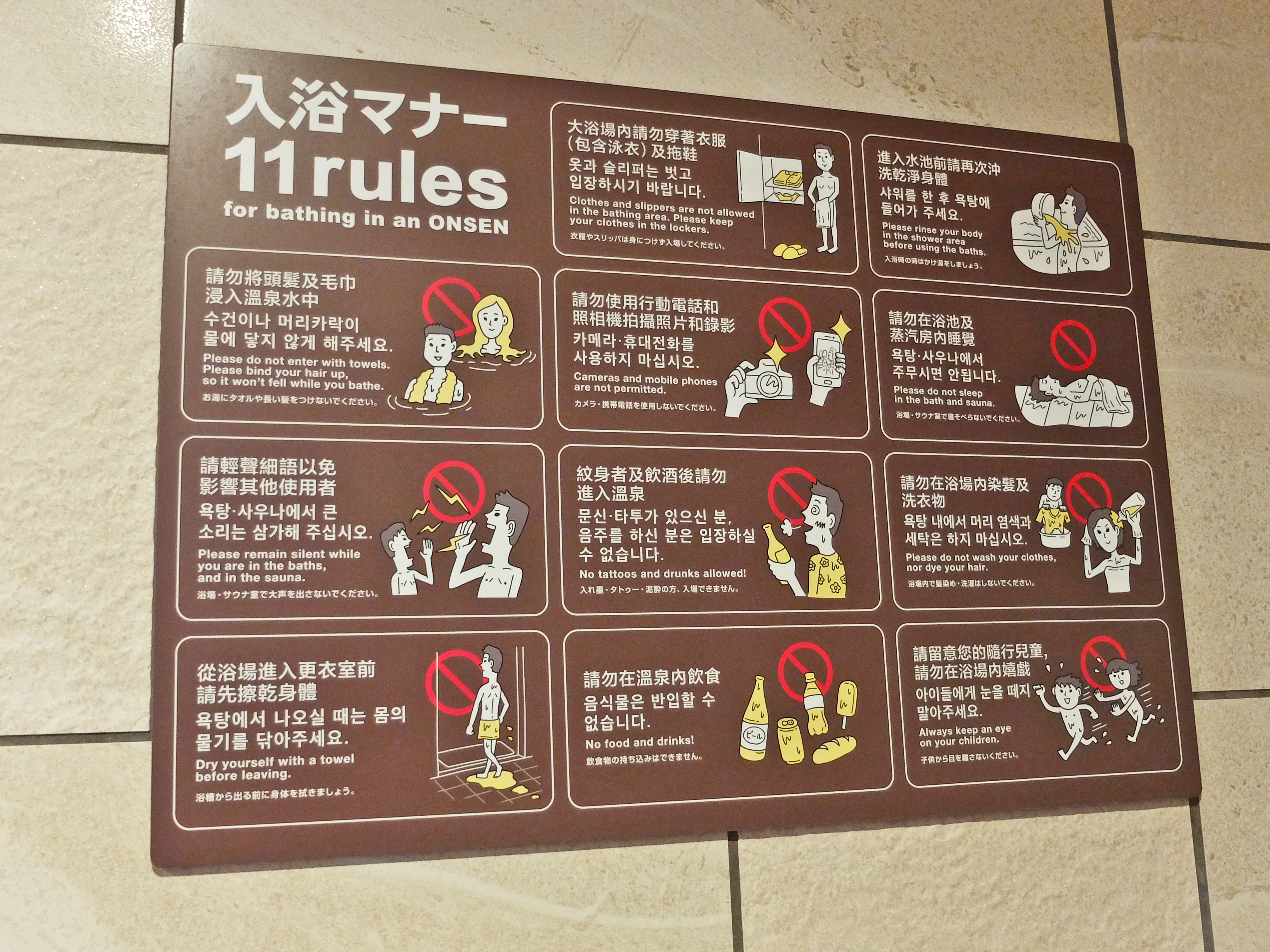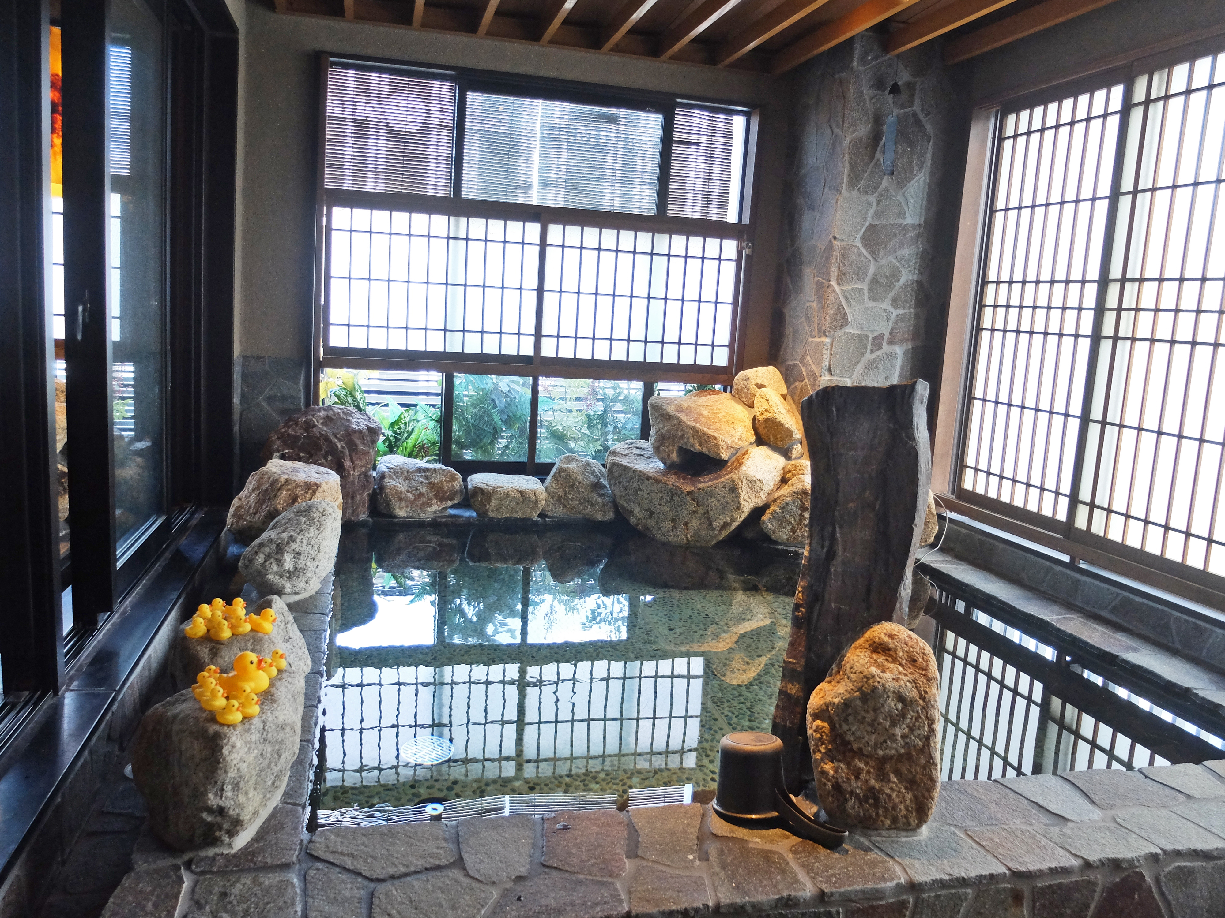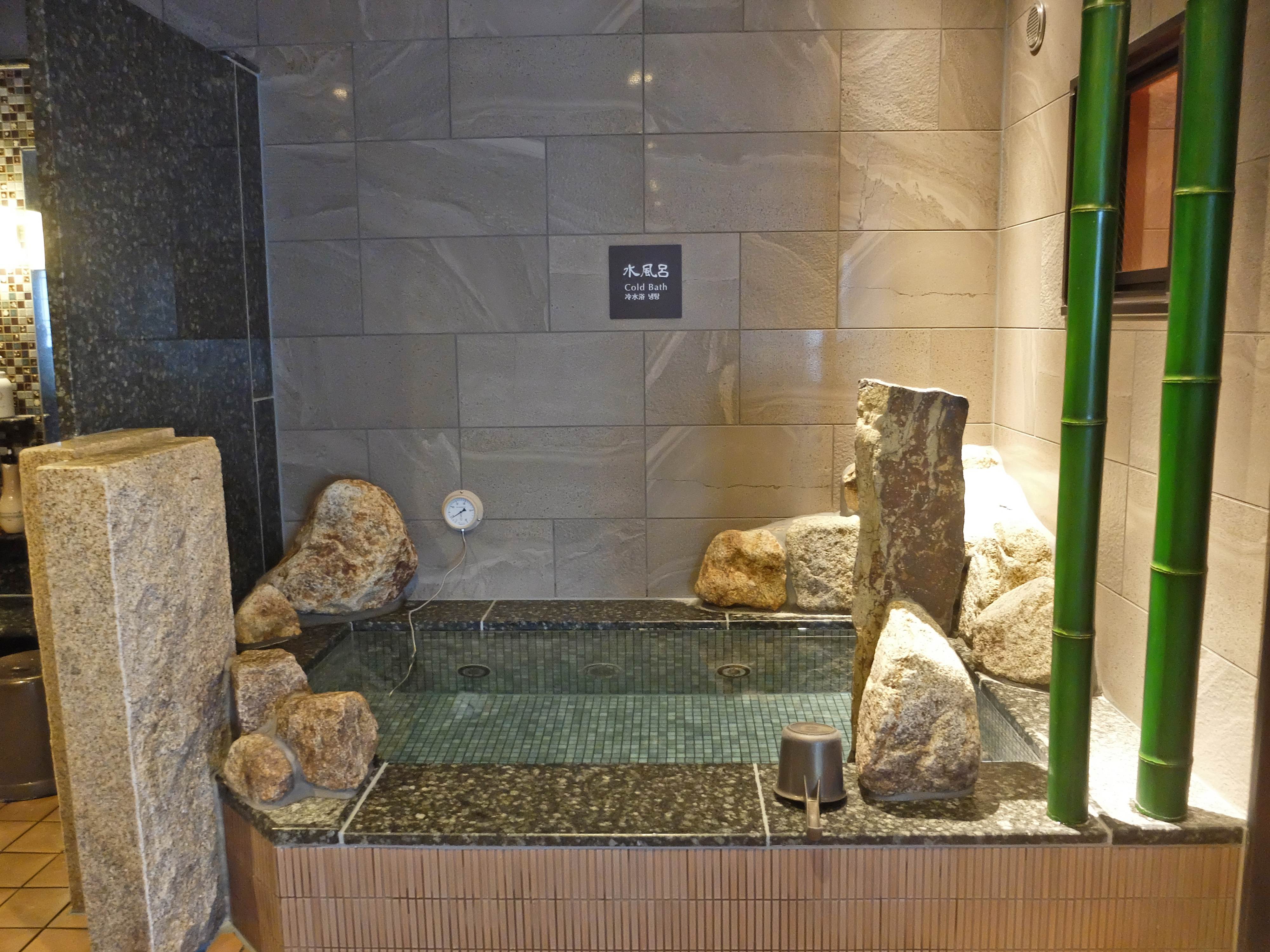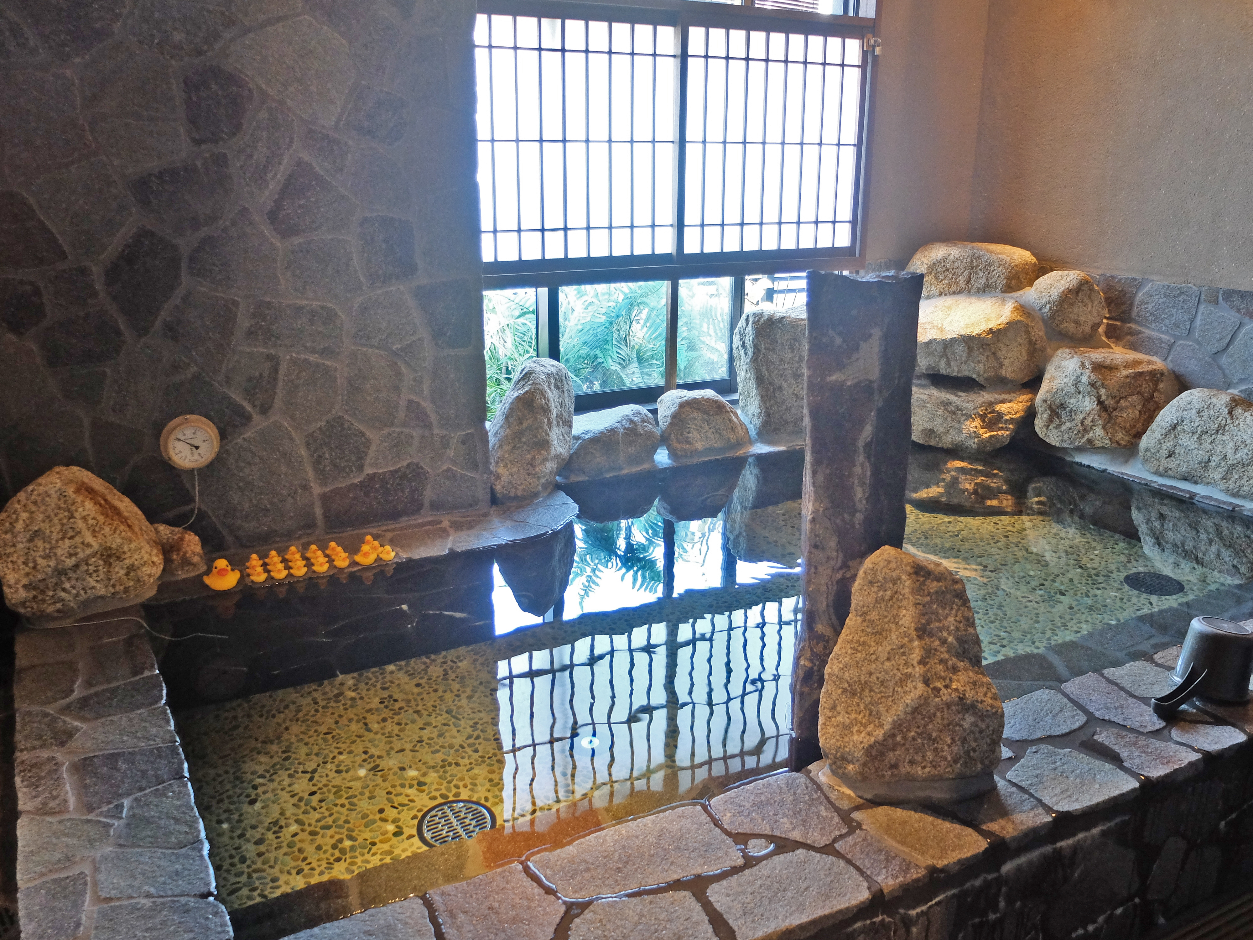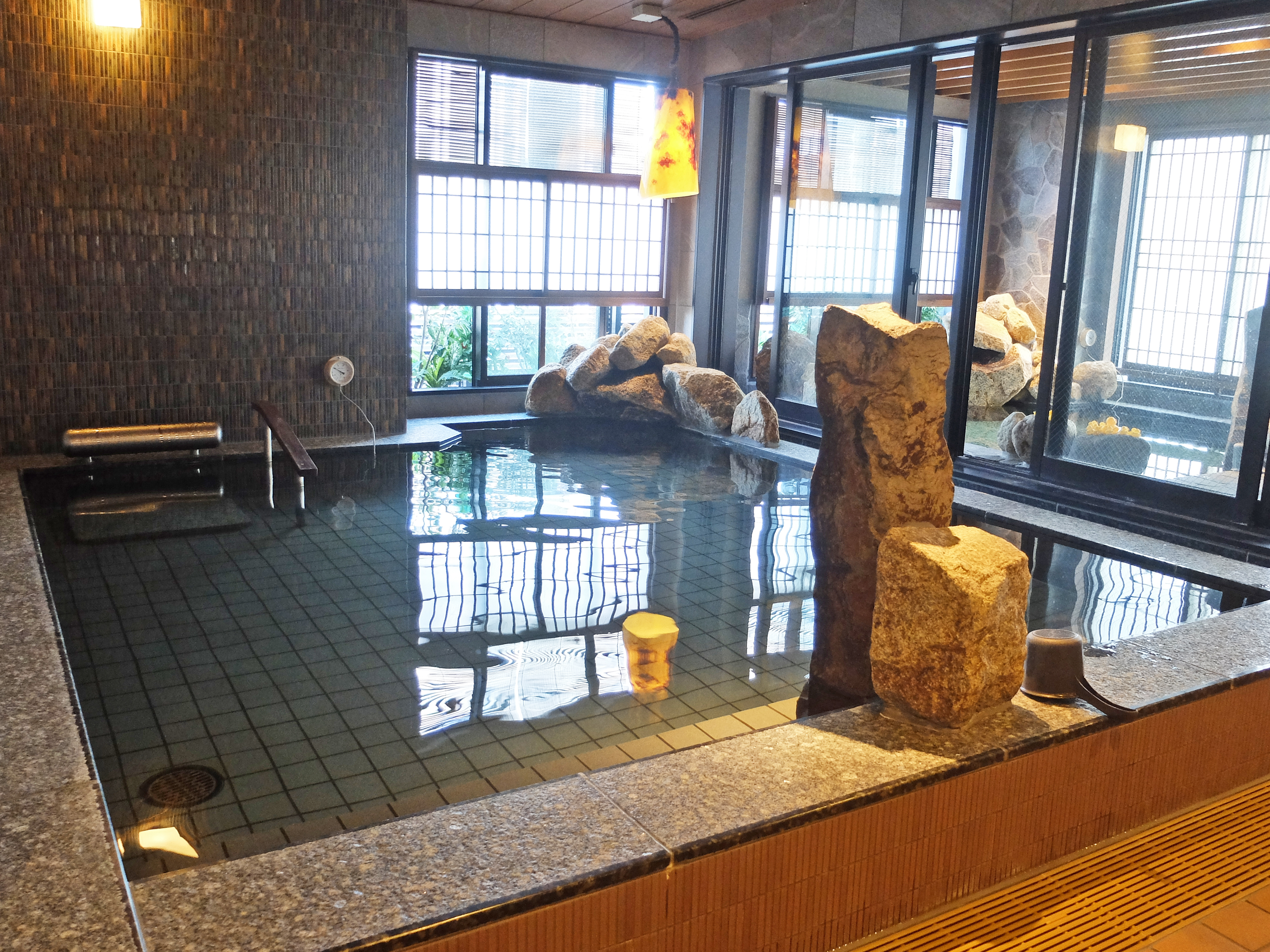 酒店職員溫馨提示入浴前需先於淋浴間沖澡(日本人的習慣是坐著沖的),然後選擇「內風呂」或「岩風呂」泡約5~10分鐘,起身到「水風呂」休息一下,再重覆(總時間不宜超過30分鐘)。每間客房都已經準備了館內著、館內拖鞋、毛巾等,換好到大浴場就可以了。大浴場內的更衣間設有儲物櫃放置個人物品,個人衛浴用品、基本護膚品、風筒等齊備。