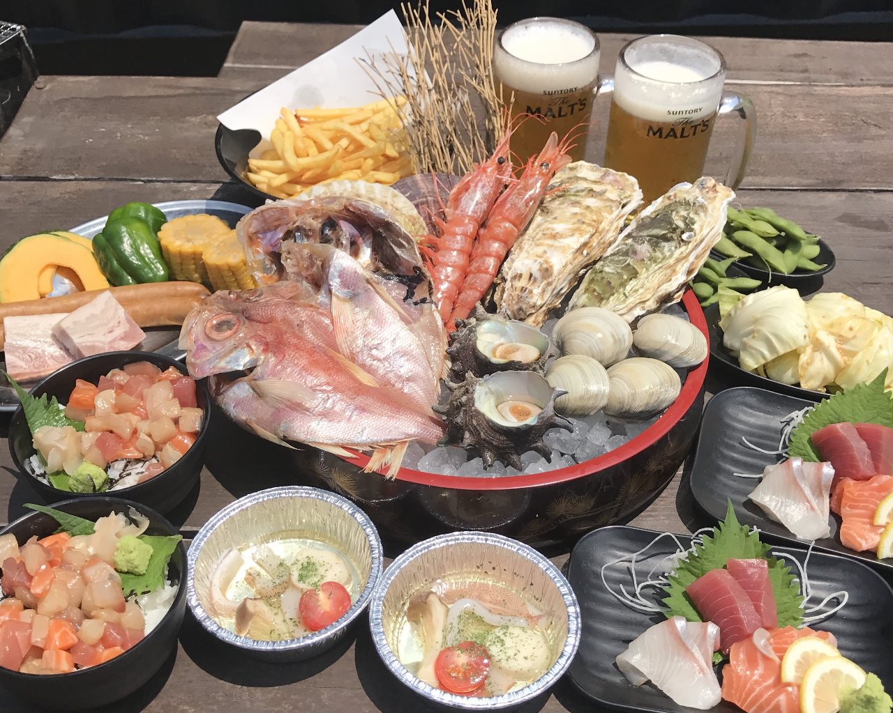 在云云料理方式當中人氣最高的一定是海鮮燒烤BBQ,海鮮燒烤套餐(3,800円)足夠2-3位食用,包括刺身拼盤三款、燒海鮮拼盤(帆立貝、榮螺、蠔、白蛽、蝦串、章魚腿串、叉牙魚乾及時令海鮮)、燒野菜拼盤四款、腸仔、厚切煙肉、迷你海鮮丼、雪糕、枝豆小食等。