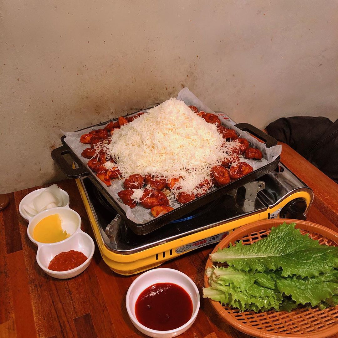 韓國人中相當有人氣的「飽肚烤腸」可是愛吃內臟者不可以錯過的弘大烤腸名店!韓國國營電視台SBS的《Live Today》也有到這間拍攝過喔!飽肚烤腸最具人氣的品項就是「雪花起司烤腸 (눈꽃막창) 」(₩29,000)。甜甜辣辣的烤腸,加上多如小山丘的起司,起司融化後,包覆著烤腸,鹹香鹹香的真的大滿足!要是覺得起司吃太多會膩的話,搭配生菜一起吃可以解膩喔!加上雪花起司烤腸會附贈一鍋牛血湯,平日敢吃豬血的朋友絕對可以吃一下,而且可以無限續鍋,真的是超值!