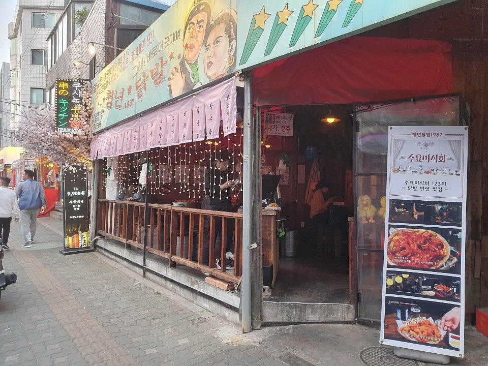 雞爪對韓國人而言,是夜深時配啤酒的宵夜美食,這間「青年雞爪1987」可是現時在弘大美食中人氣最火爆的辣雞爪名店!「青年雞爪1987」原本已經是韓國年輕人必去的弘大美食店,被韓國吃貨節目《週三美食匯》推薦後,人氣更是居高不下。