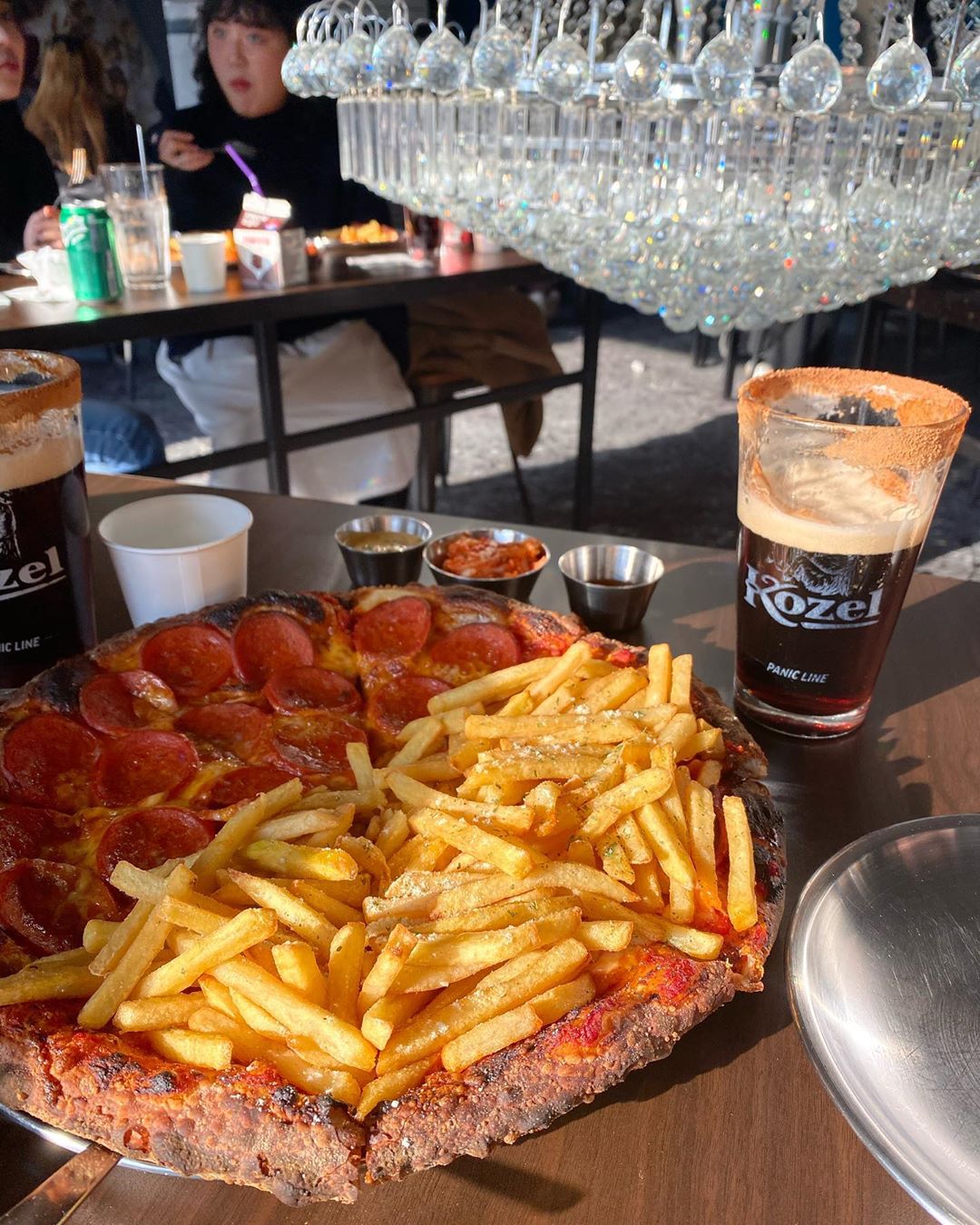 Pizza Never Sleeps主打的Pizza有「PEPPERONI」(₩21,000),這個Pizza一半是辣肉腸,另一半是滿滿的薯條,夠意想不到吧!現烤的薄Pizza嚼勁十足,加上店家提供的蜂蜜醬,甜鹹甜鹹的非常好吃!