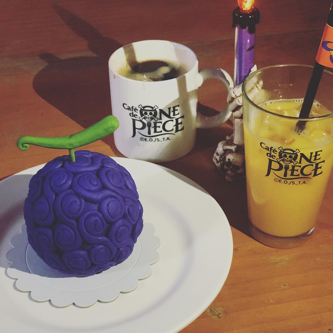 想要到二樓的千陽號甲板上用餐的話,每人最低消費是點 1 杯飲料,而店內必吃的就是惡魔果實造型蛋糕,其外表就跟路飛小時候吃的紫色超人系橡膠果實一模一樣!切開蛋糕就可以看到紮實的朱古力布郎尼和忌廉夾心,還有馬卡龍也是惡魔果實造型!另外,喬巴造型雞蛋糕也是相當受歡迎!