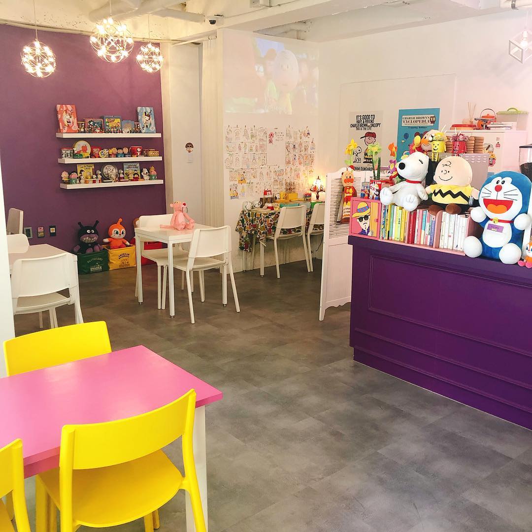 Kohinoriba是以麵包超人和Snoopy為主題的咖啡廳,雖然位於京畿道坡州,距離首爾市區比較遠,但整間咖啡廳的設計相當可愛,門口就像個等候公車的站,有一排黃色坐椅可以坐著打卡影相,而店內有Snoopy動畫投影,各種卡通擺設可以作打卡道具,而且還有Hello Kitty、米奇老鼠、不二家 牛奶妹等卡通精品販售!