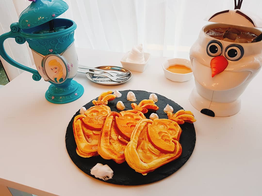 位於釜山水營區的Mushu House,是以迪士尼為主題的咖啡廳,店內的所有餐具都是店主自己從世界各地的樂園買回來,有各個不同迪士尼角色的造型杯子,又有對應角色的餐具,而這裏的生招牌甜品就有毛毛蘇利文蛋糕、大眼仔米高甜甜圈和Olaf Waffle!覺得單點太貴的話,也可點冰美式咖啡配鬆餅的套餐。