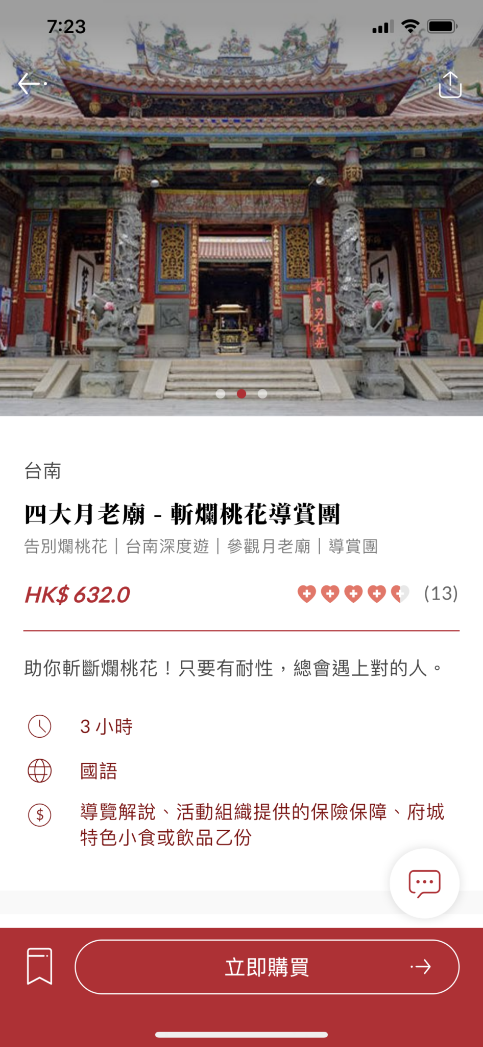 其中一個很多人查詢的體驗,是「台南四大月老廟 – 斬爛桃花導賞團」。台南月老又多又靈驗,此團會帶大家去找相應的月老,為你斬斷爛桃花,尋找好姻緣