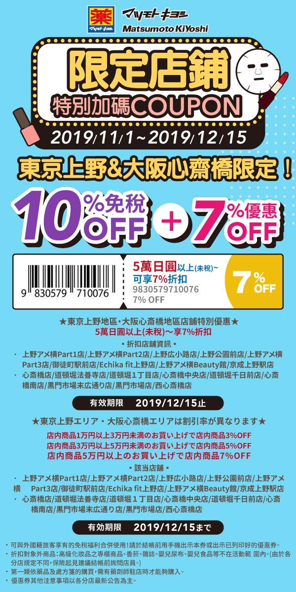 ‣東京上野及大阪心齋橋松本清限定優惠券