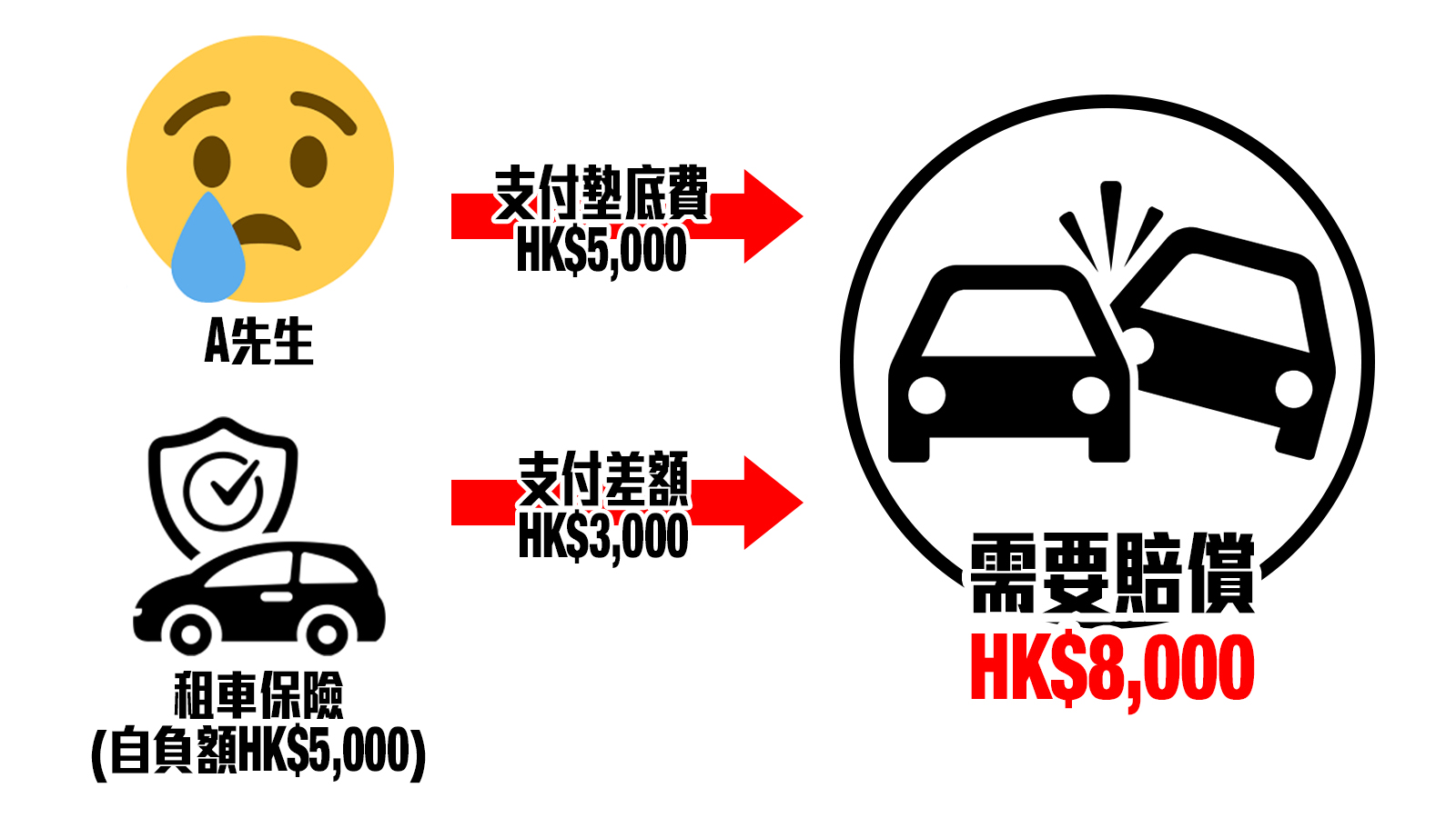 延續事例一,A先生自費全額賠償(HK$8,000)後返港,發現旅遊保險內的「租車自負額保障」有上限HK$5,000的保障,遂向保險公司索償,最後成功獲得HK$5,000賠償,以彌補HK$8,000的損失。扣減旅遊保險的理賠金額後,A先生的損失金額減少至HK$3,000。