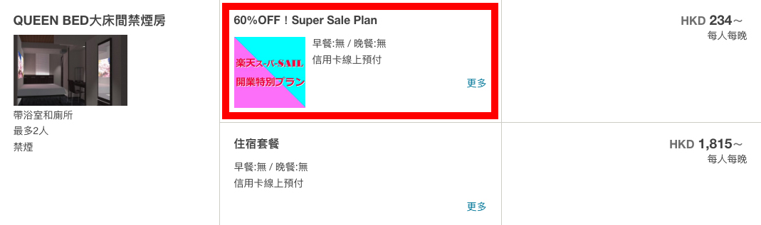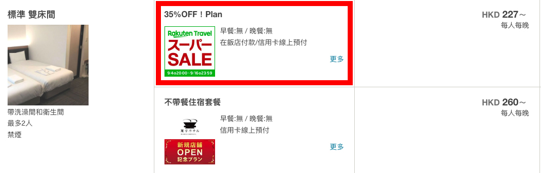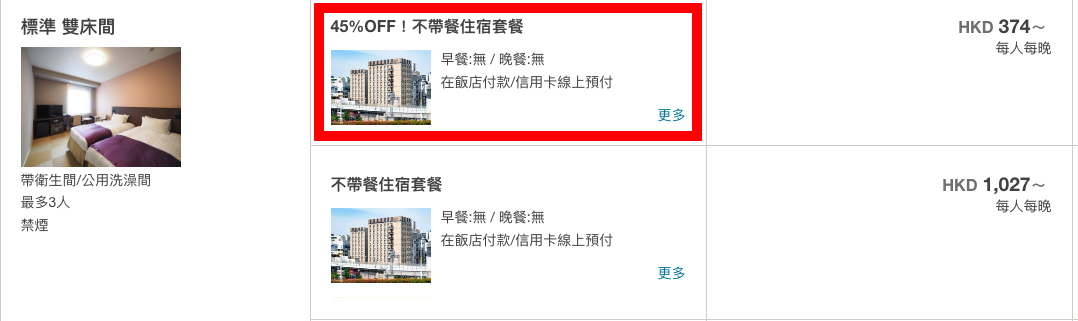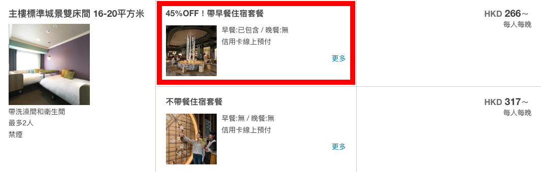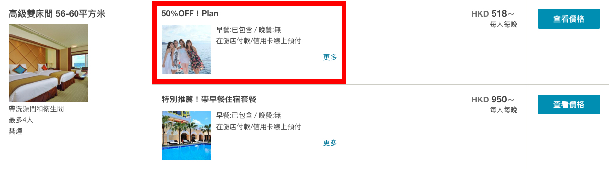 - 適用酒店:指定參與活動的酒店(搜尋後會出現折扣方案選項,點選方案並完成預訂即可)