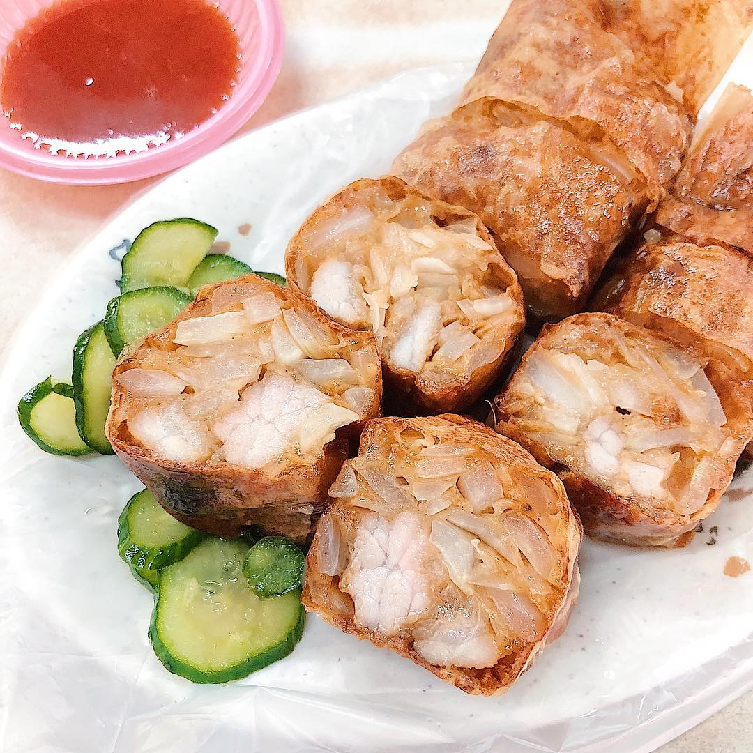 名叫「雞捲」,可是別給它的名字被騙了!雞捲裡的內餡是沒有雞肉的,裡面包的是豬肉粒和洋蔥而已,會叫雞捲的原因是源自於台語「捲起剩菜」的意思。而雞捲一份量是真的不少,怕膩口的話可以配旁邊附上的醃製青瓜片。