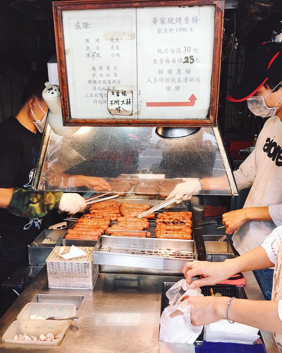 1990年開業的黃家香腸,從絞肉、灌腸、成型、烘烤全不假他人之手,都是店家一手包辦。烤好的香腸外表看起來油油亮亮的,卻不會油膩。香腸外酥內脆,瘦肉和肥肉比例完美,肥肉不會太多,整體不會太油膩,汁多味美,讓人意猶未盡。而且喜歡吃重口味的朋友,還可以拿一旁放著的新鮮蒜頭配著吃喔!