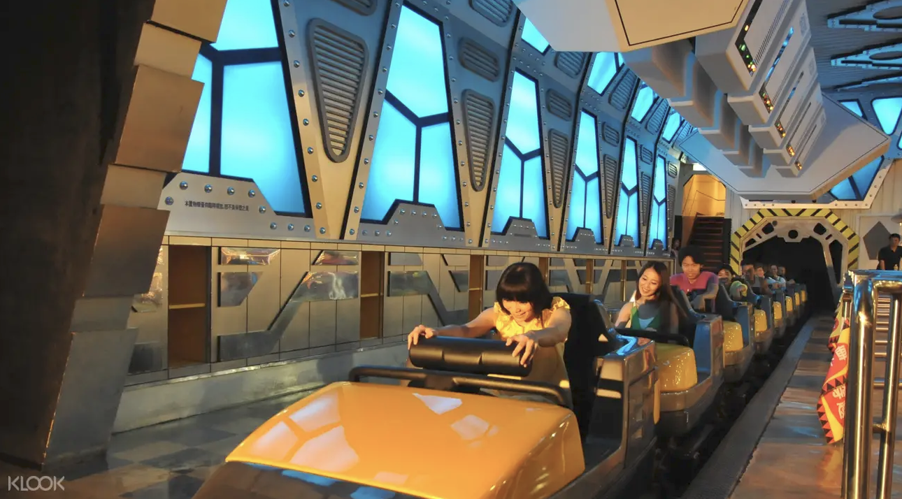 「太空山」是一個室內過山車,軌道全長450米,時速高達61公里,只需1分15秒就會搭完全程,而乘客在整個過程都是處於黑暗之中翻轉滑行,就像是進入了太空探險一樣!