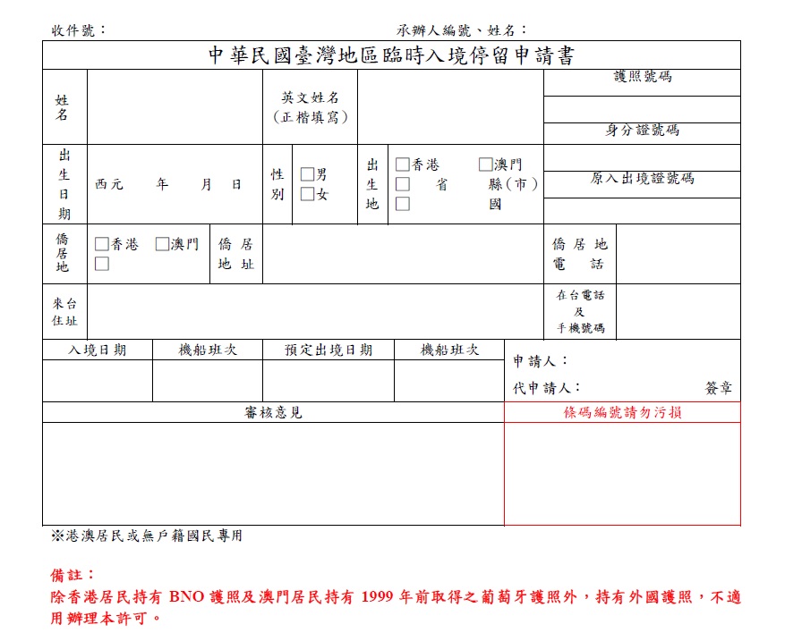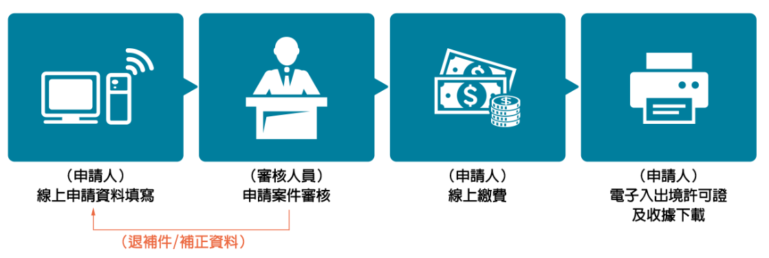 - 費用:單次入出境證NT600、一年多次入出境證NT1000、三年多次入出境證NT2000