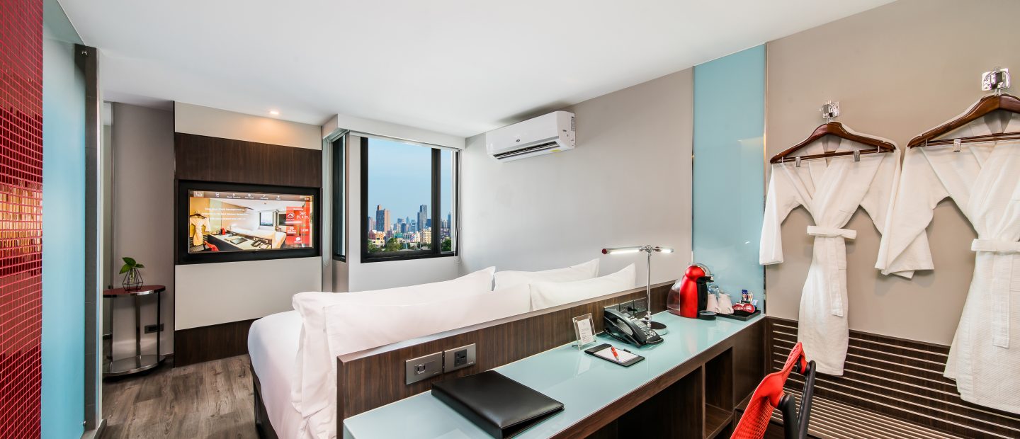 酒店共有4種不同的客房,房間寬敞帶點工業風,朝氣時尚,所有客房更享有天際線景觀,可以在房間內將曼谷美景盡收眼底。
